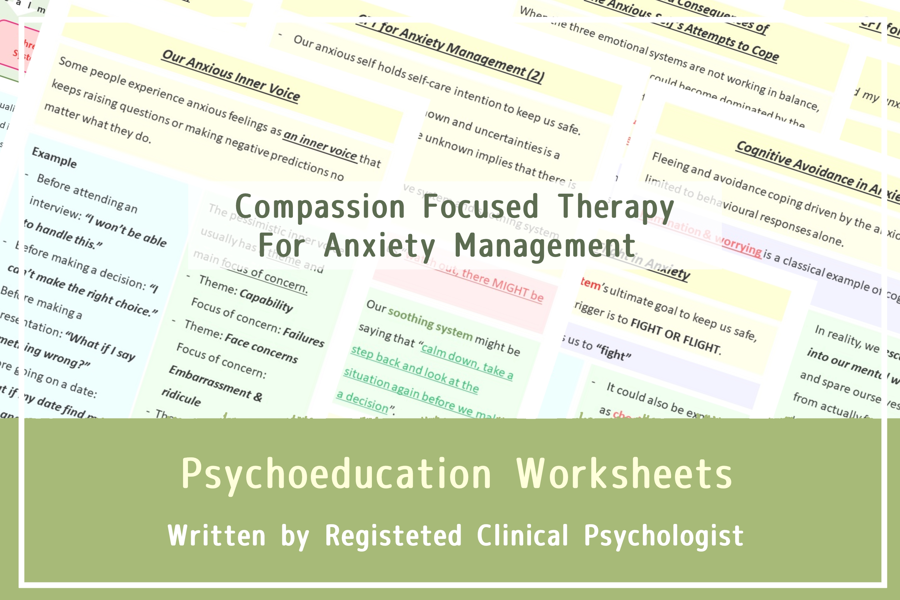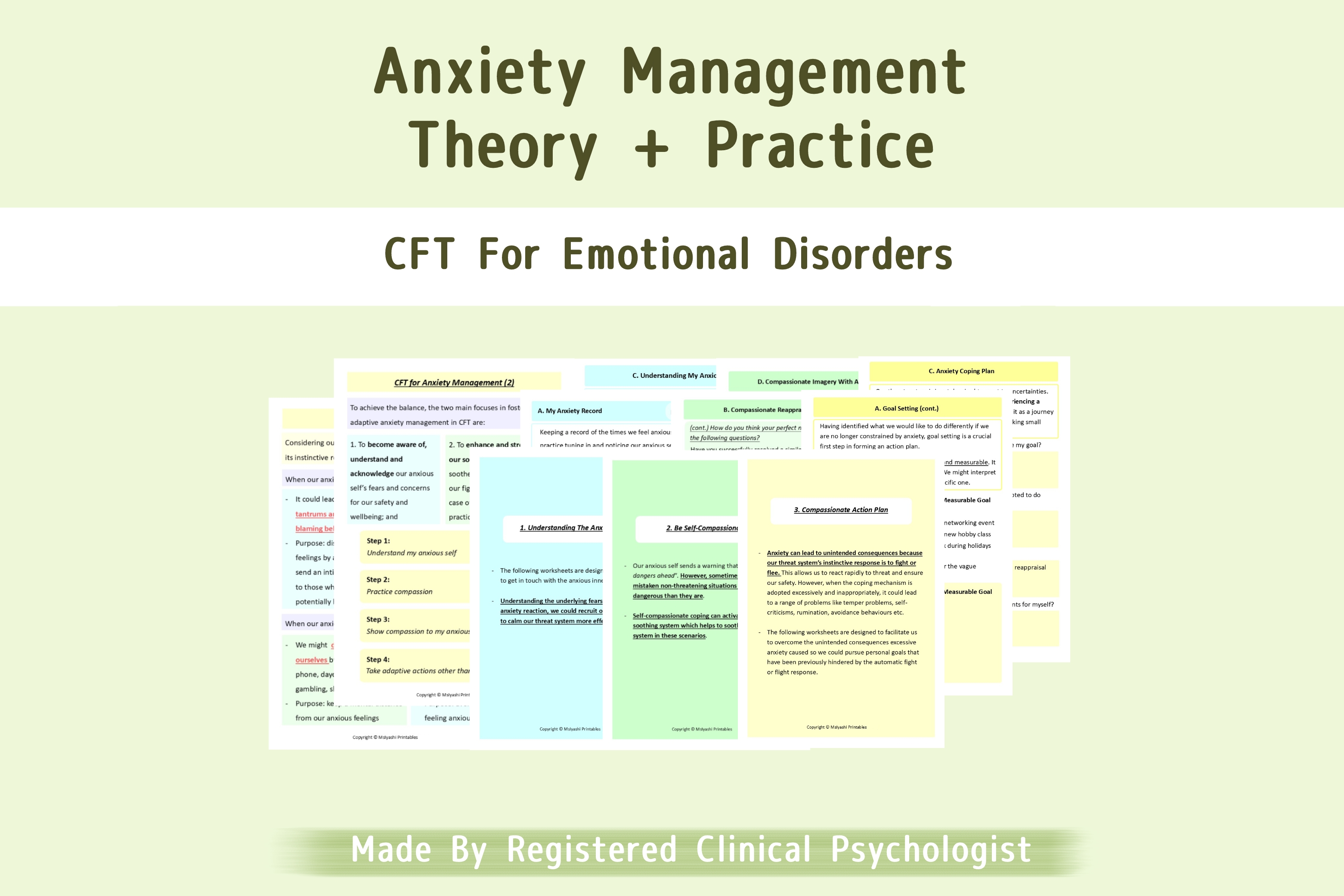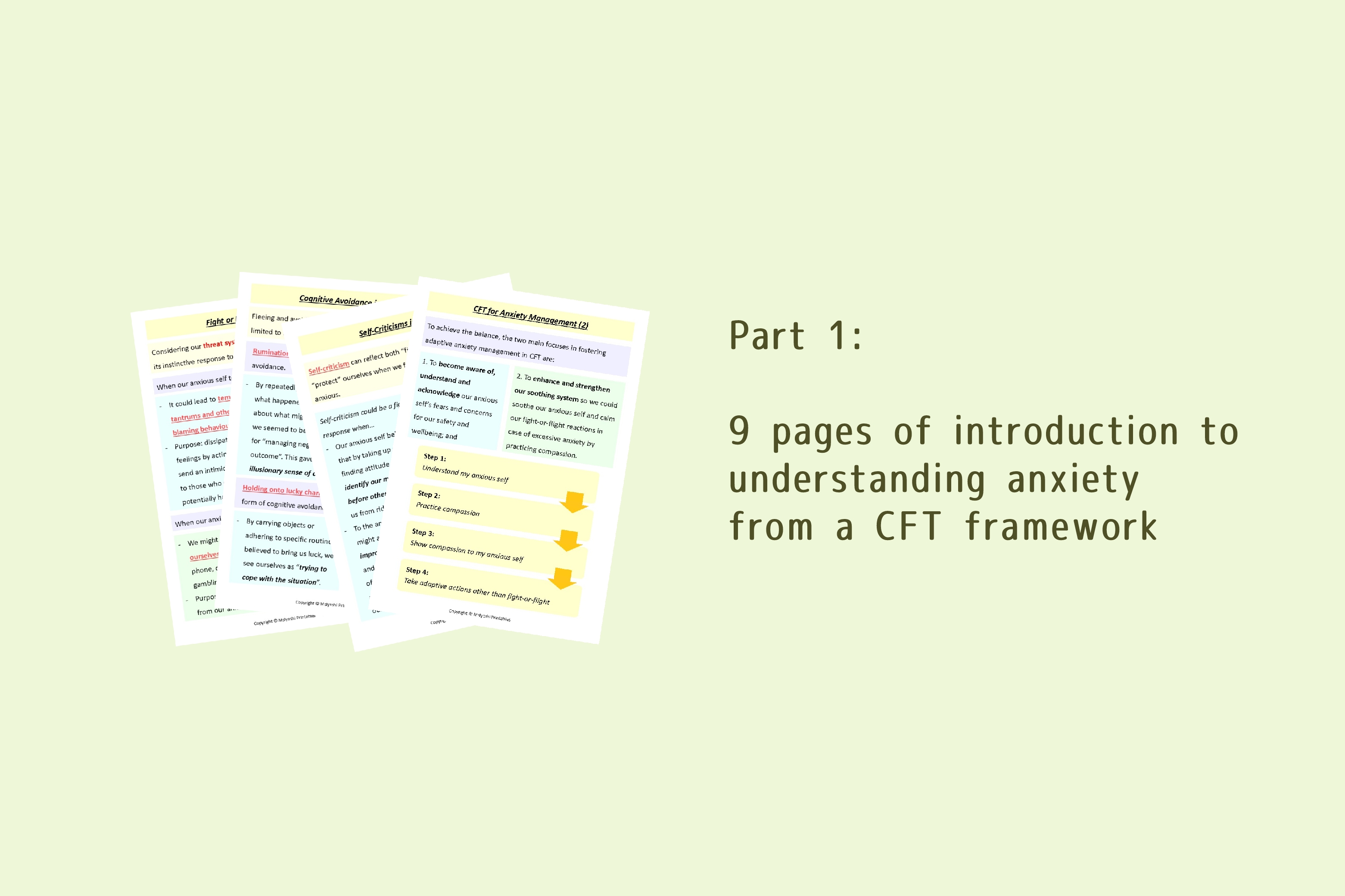 Nine pages of psychoeducation information sheets explaining the theory underlying CFT approach for anxiety management.