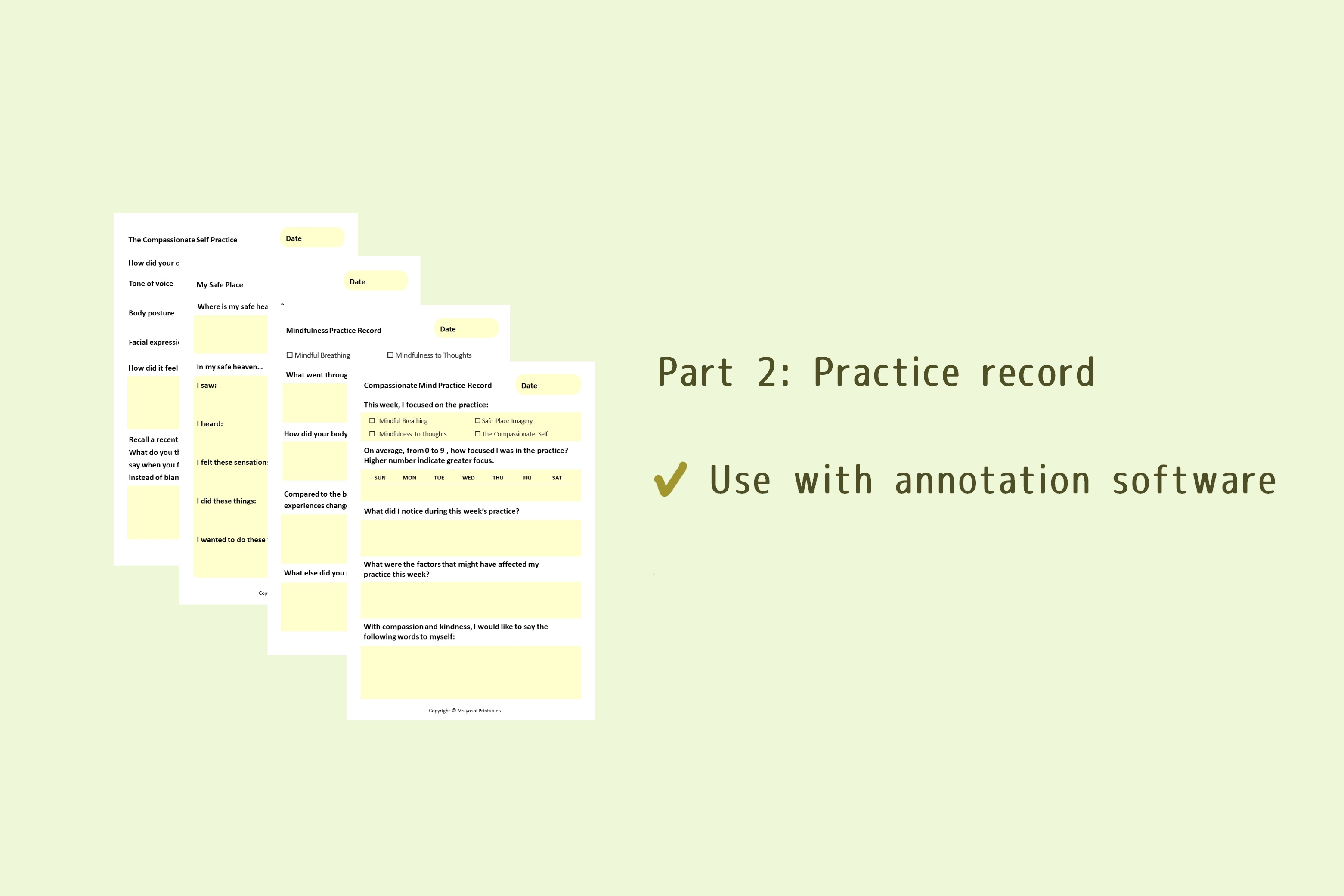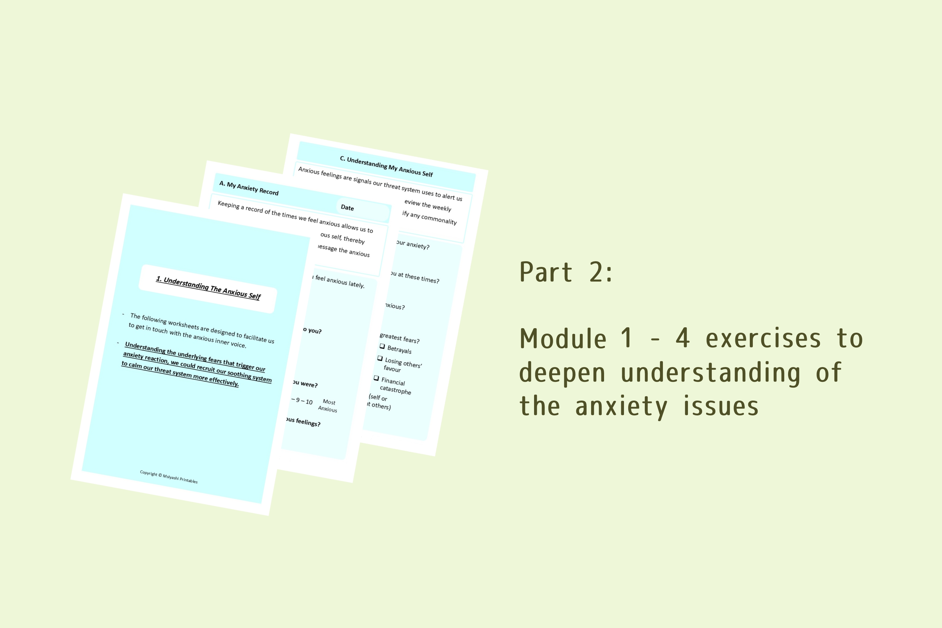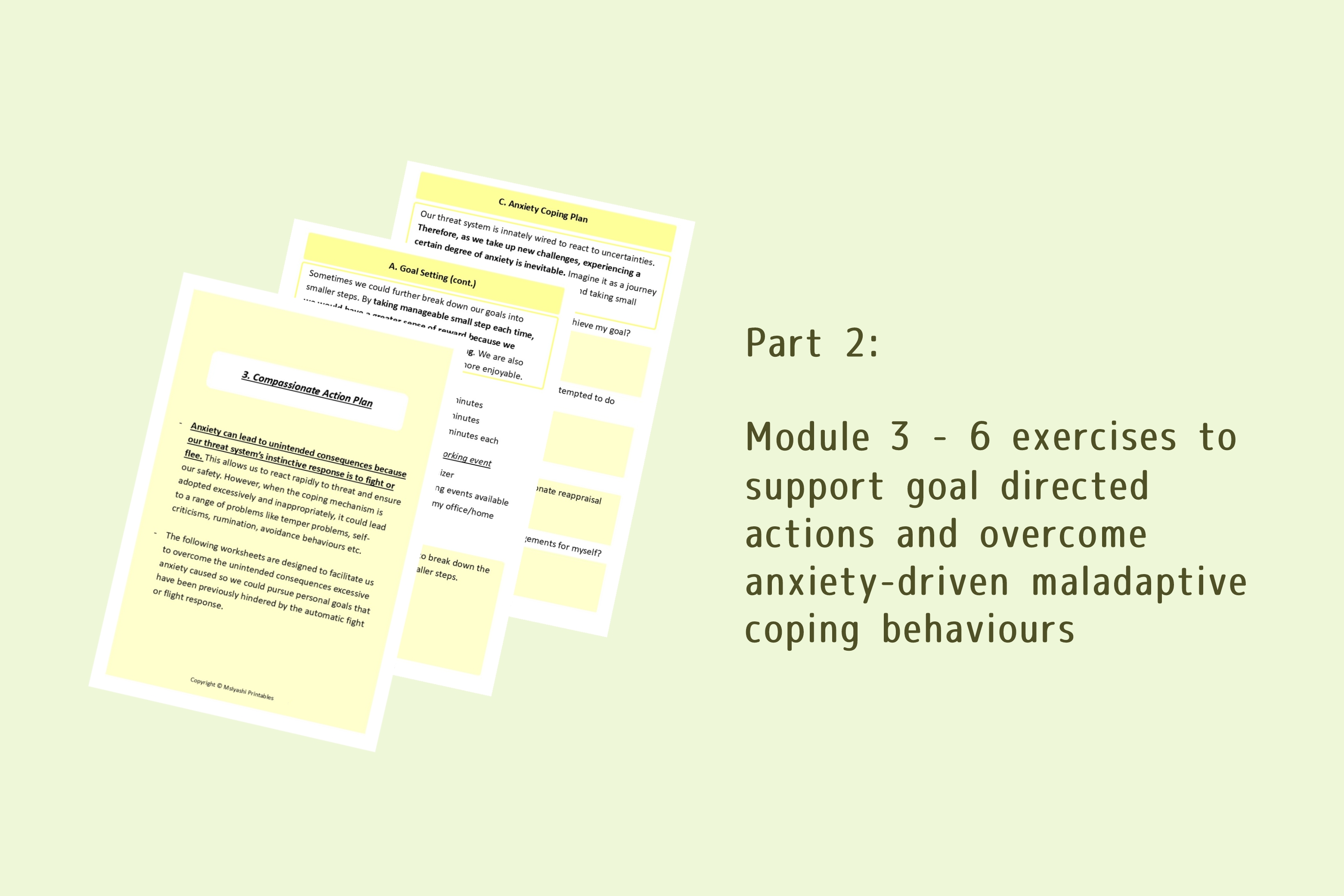 Nine pages of psychoeducation information sheets explaining the theory underlying CFT approach for anxiety management.