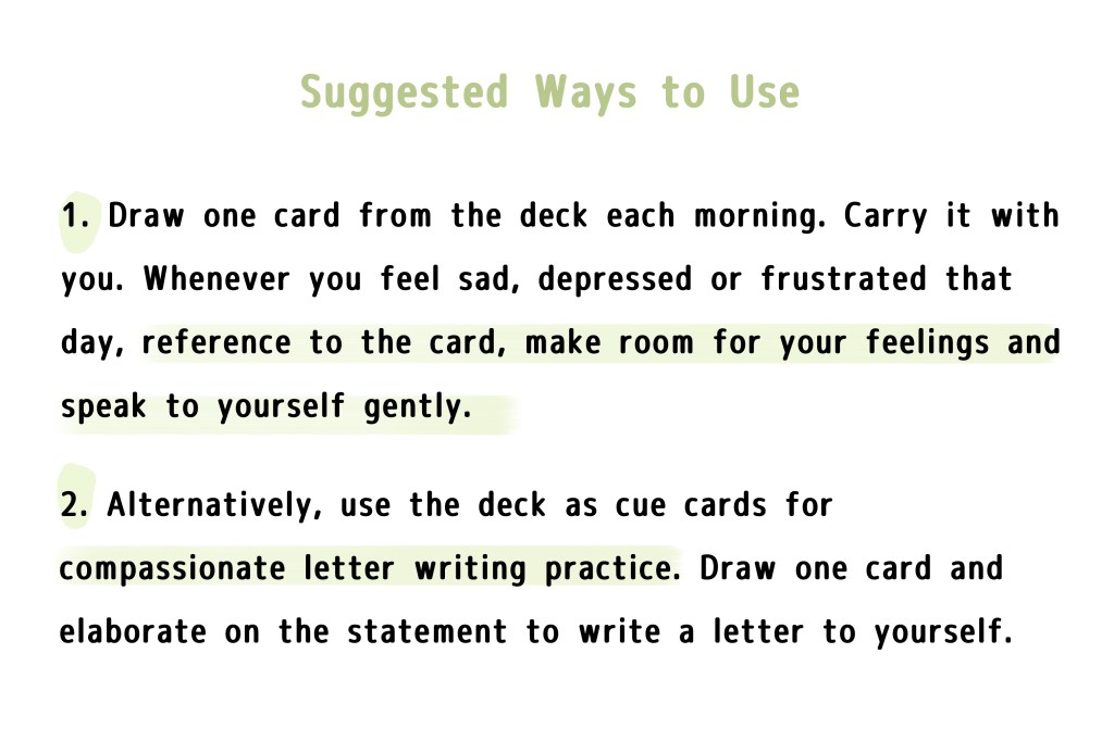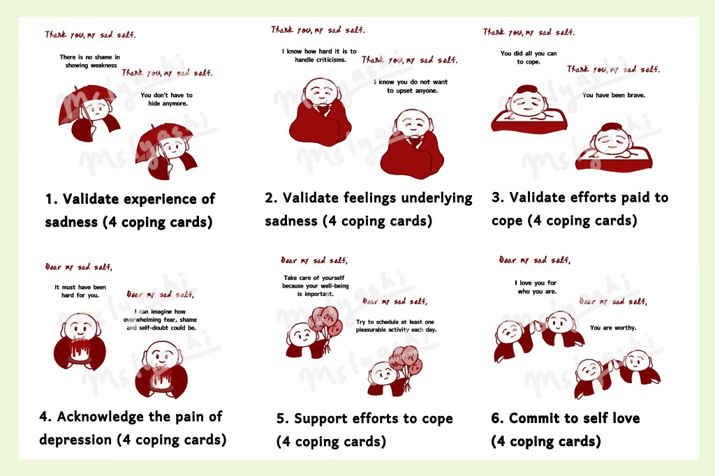 A set of 24 depression coping cards featuring various compassionate self-talk with baby buddha illustrations.
