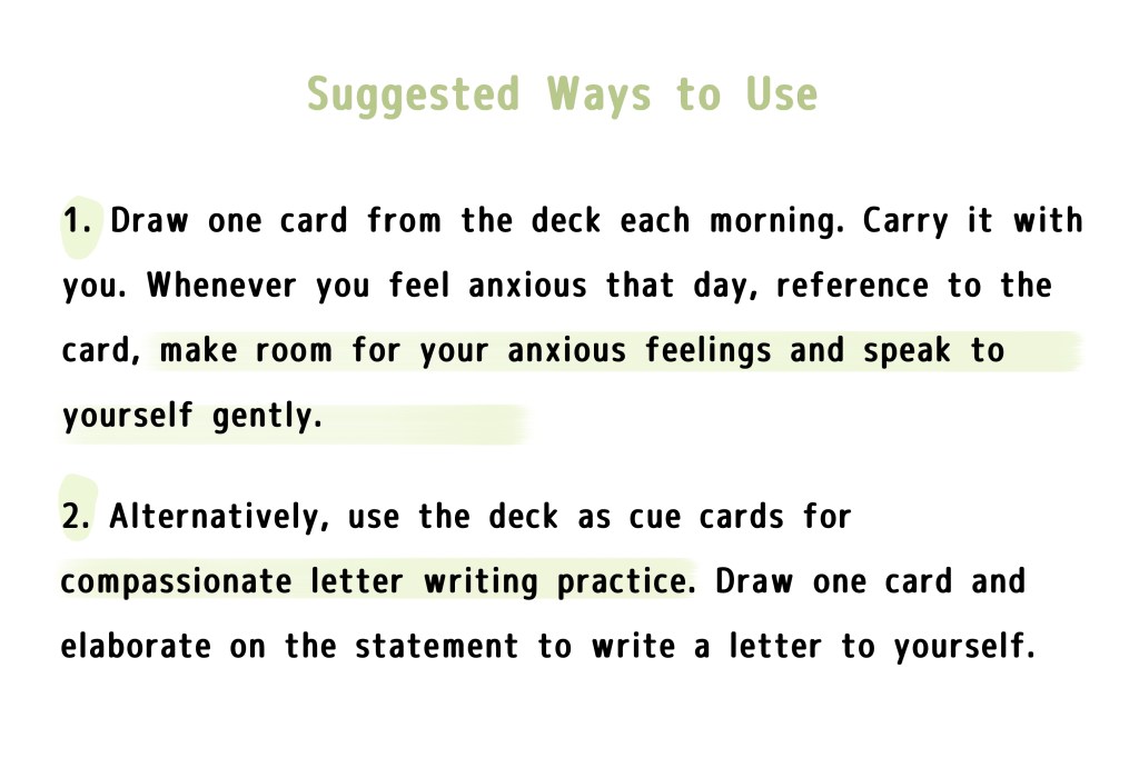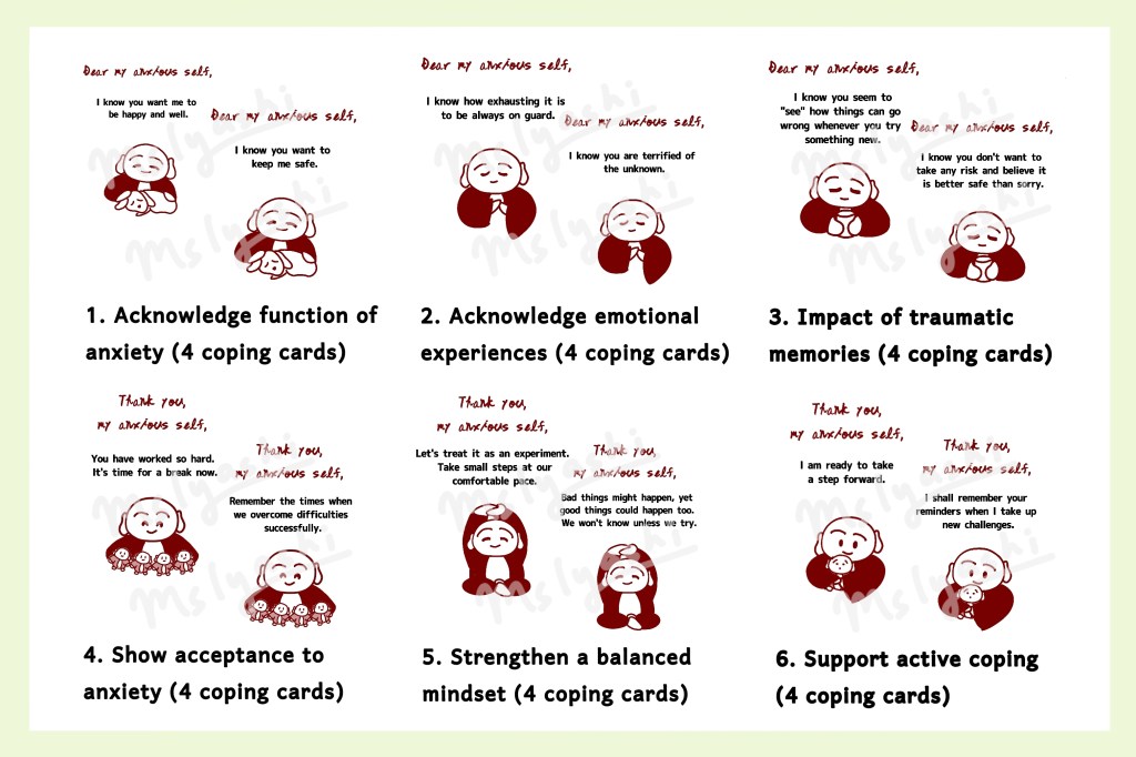 A set of 24 anxiety coping cards featuring various compassionate self-talk with baby buddha illustrations.