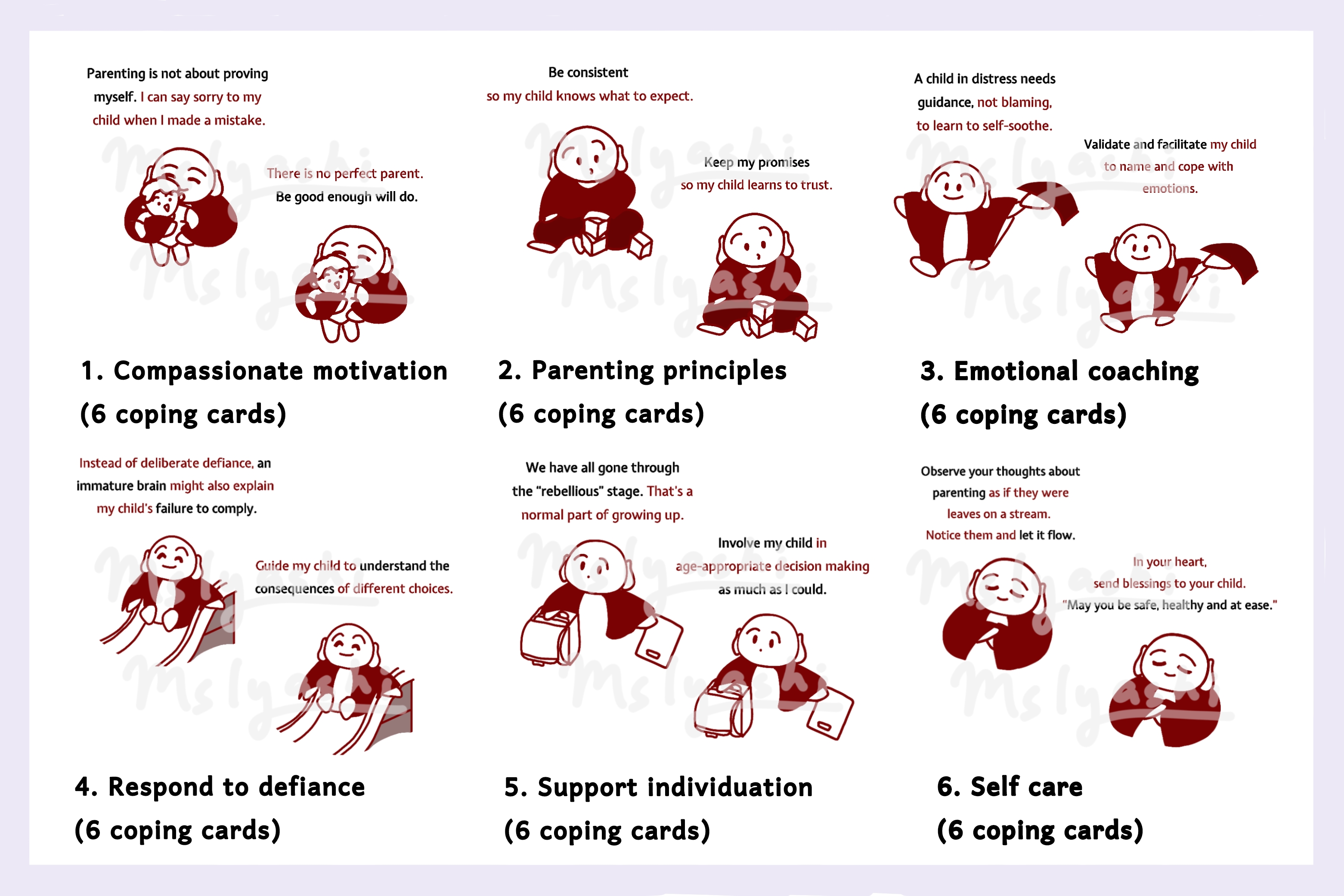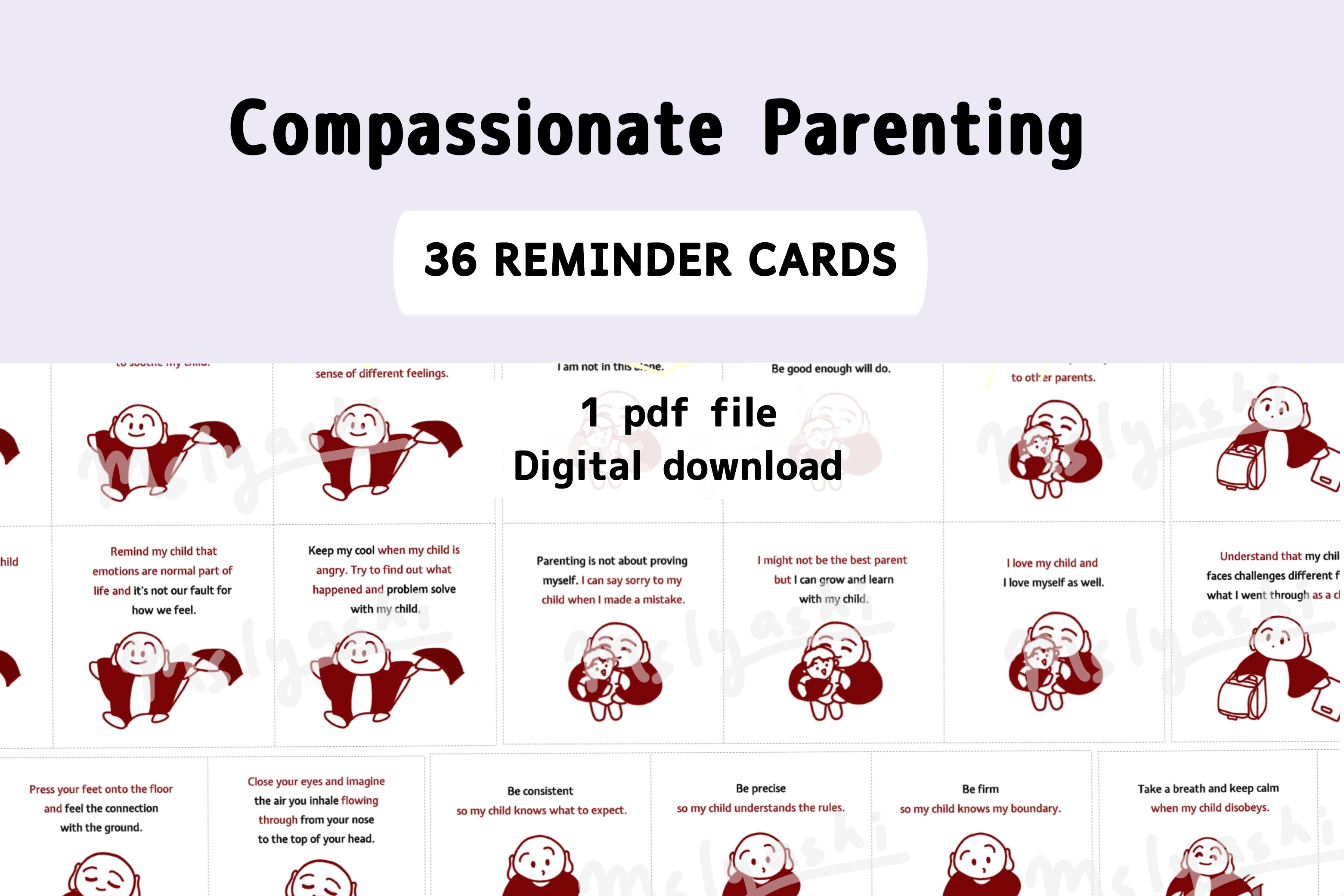 A set of 36 compassionate parenting reminder cards with baby buddha illustrations.