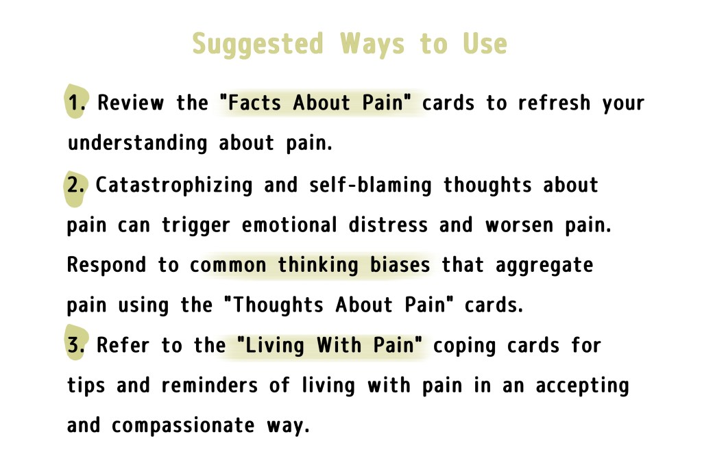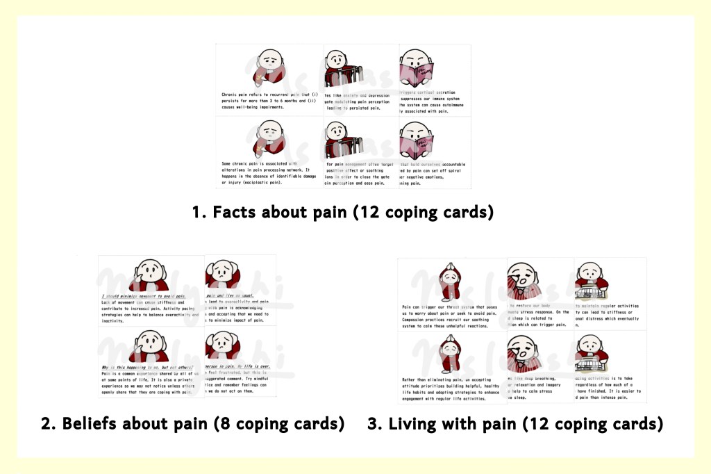 A set of 32 pain management coping cards to strengthen pain acceptance and the attitude of living with pain in mindful compassionate way.