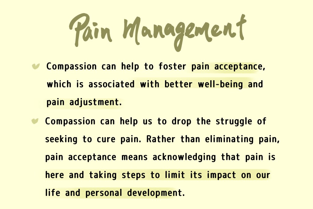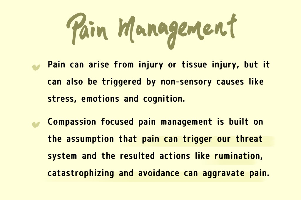 Learn to soothe our emotional distress arising from pain with compassion and adjust our time active to reduce the flare-up of pain so that we can still take actions to pursue meaning life goals despite the presence of pain.