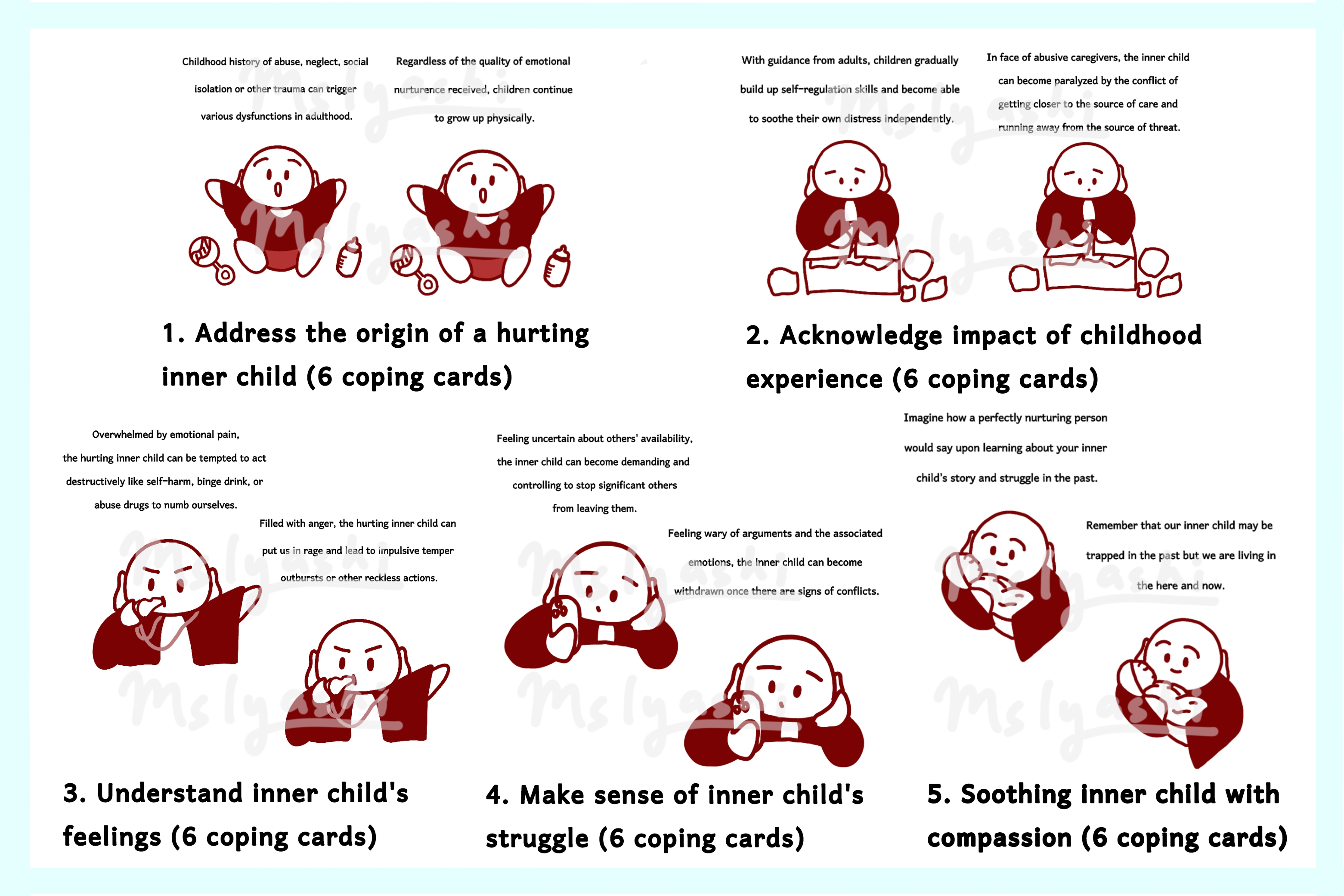 - These cards are designed to facilitate recovery from childhood trauma and the hurting inner child by adopting a more balanced mindset and self-compassionate attitude. They are written based on the rationale that while there is no quick fix to trauma, self-compassion could guide us through the healing journey.