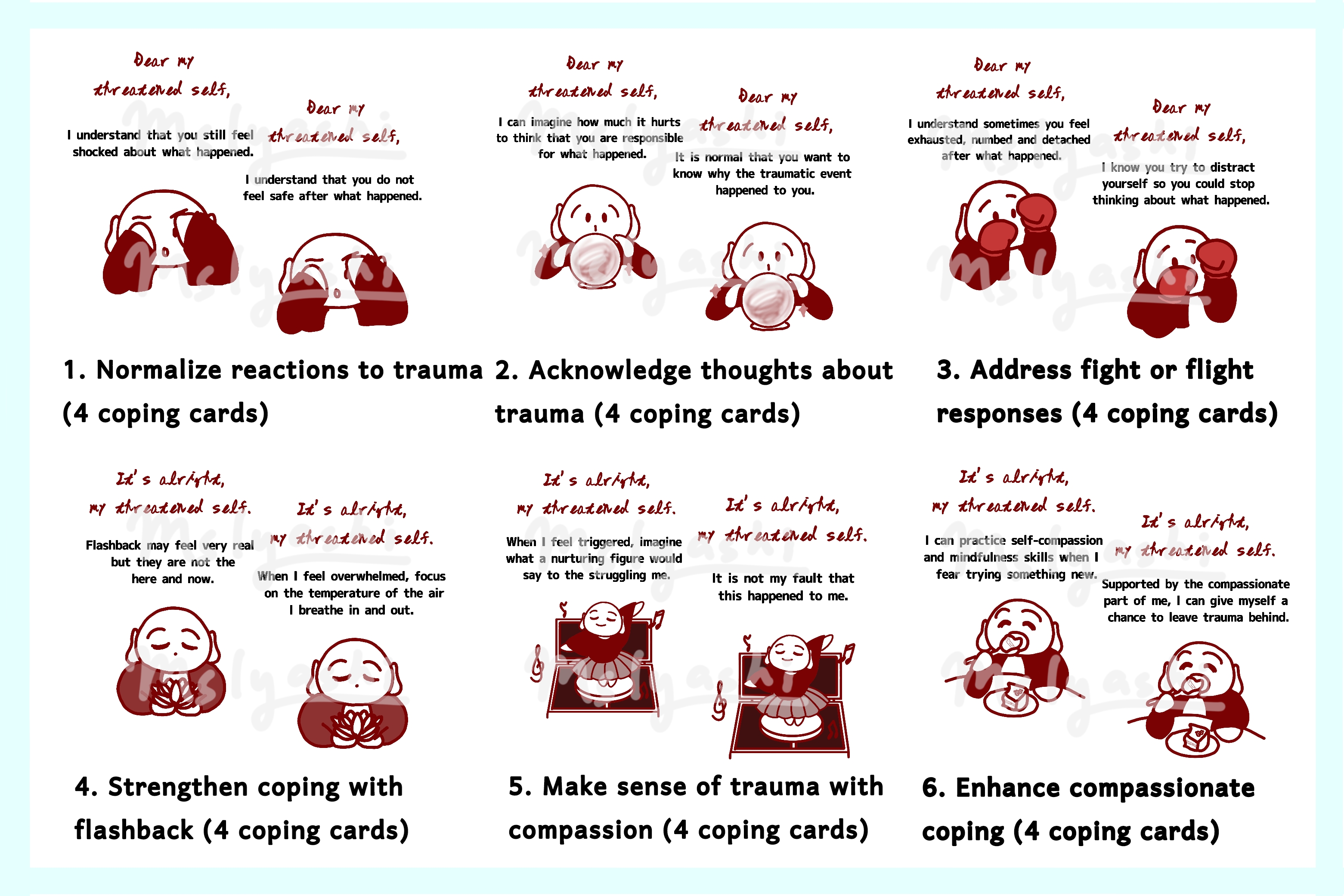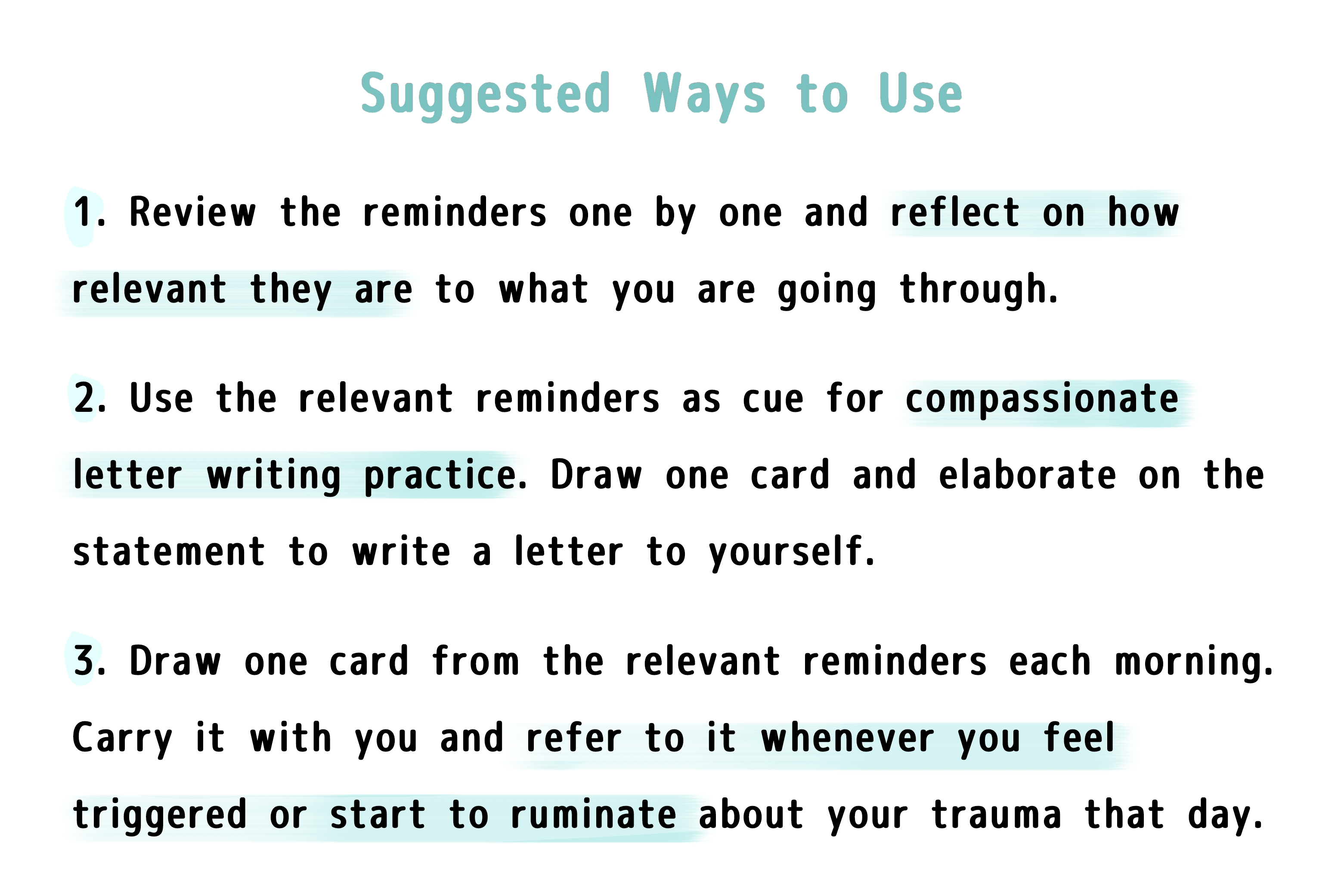 - They can be used as reminders to cope with triggers or rumination in day to day life or as cue cards for compassionate letter writing to facilitate healing.