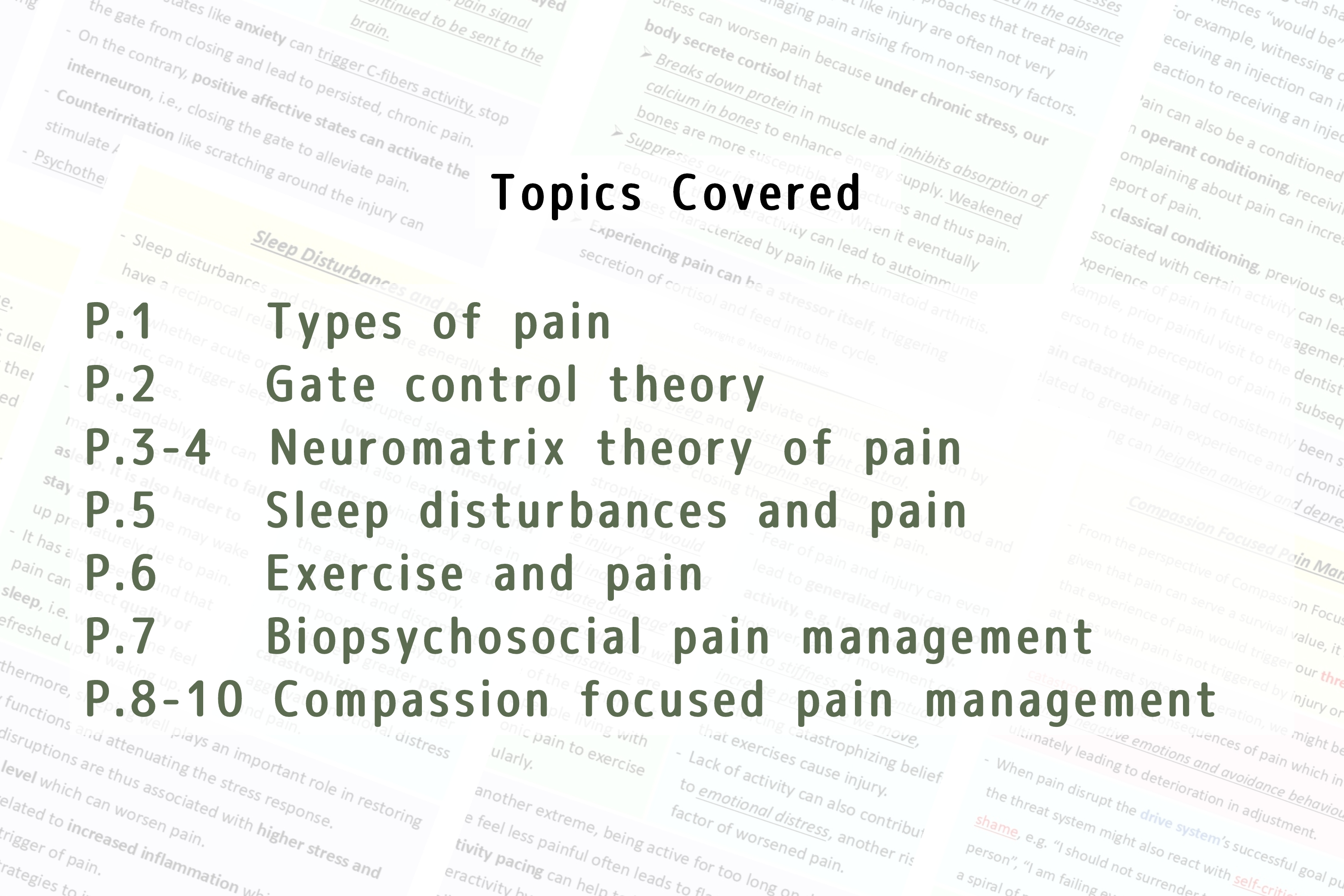 In this purchase, you will get 10 pages of psychoeducation information sheets covering theory of pain like the gate control theory and neuromatrix theory, the reciprocal relationship between pain and sleep, as well as the importance of an appropriate level of exercise on pain management. It is completed with an introduction of the rationale of compassion focused approach to managing pain and improving quality of life.