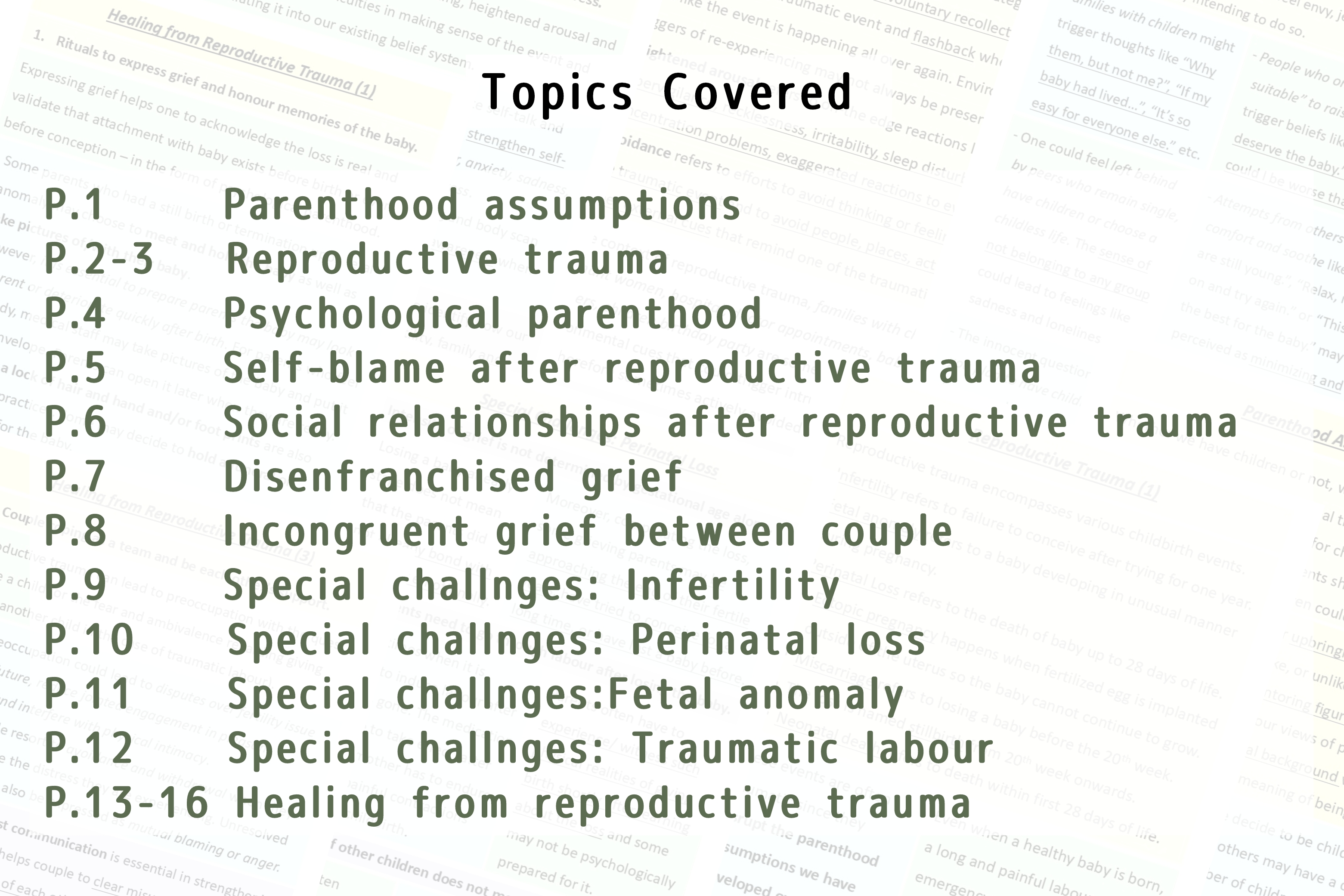 This set of psychoeducation worksheets cover a range of topics like introduction of how reproductive trauma threaten our assumptions about becoming parents, reasons that we easily fall into a trap of self-blame following reproductive trauma, the challenges in managing social relationships while recovering from reproductive trauma, the often unspoken and unnoticed grief associated with reproductive trauma and challenges specific to infertility, perinatal loss (miscarriage, stillbirth, neonatal death), fetal anomaly and traumatic labour. Finally, the set is completed with an overview of the four steps to heal from reproductive trauma.