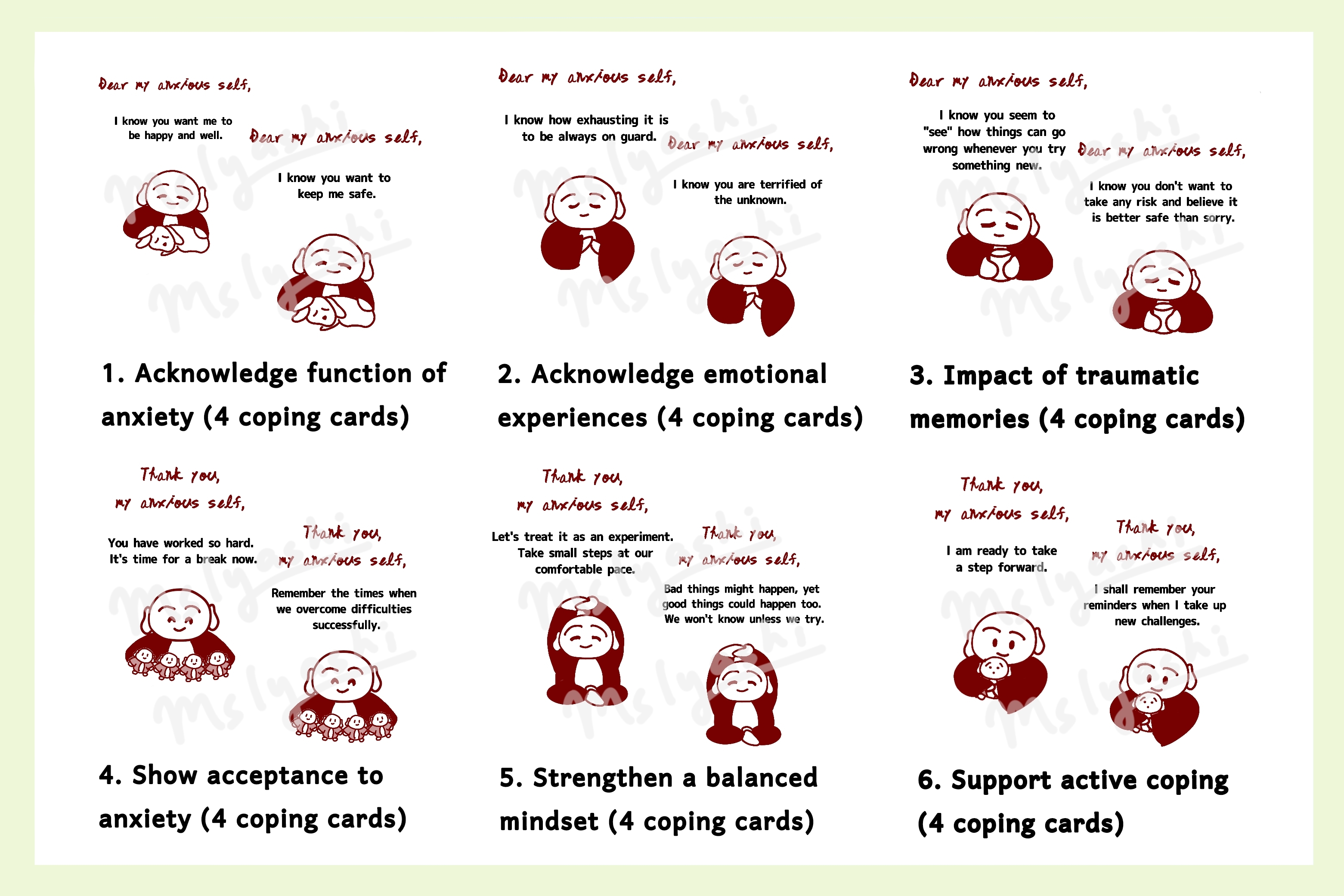 You can use these as anxiety coping cards in your day to day life or as cue cards for compassionate letter writing.