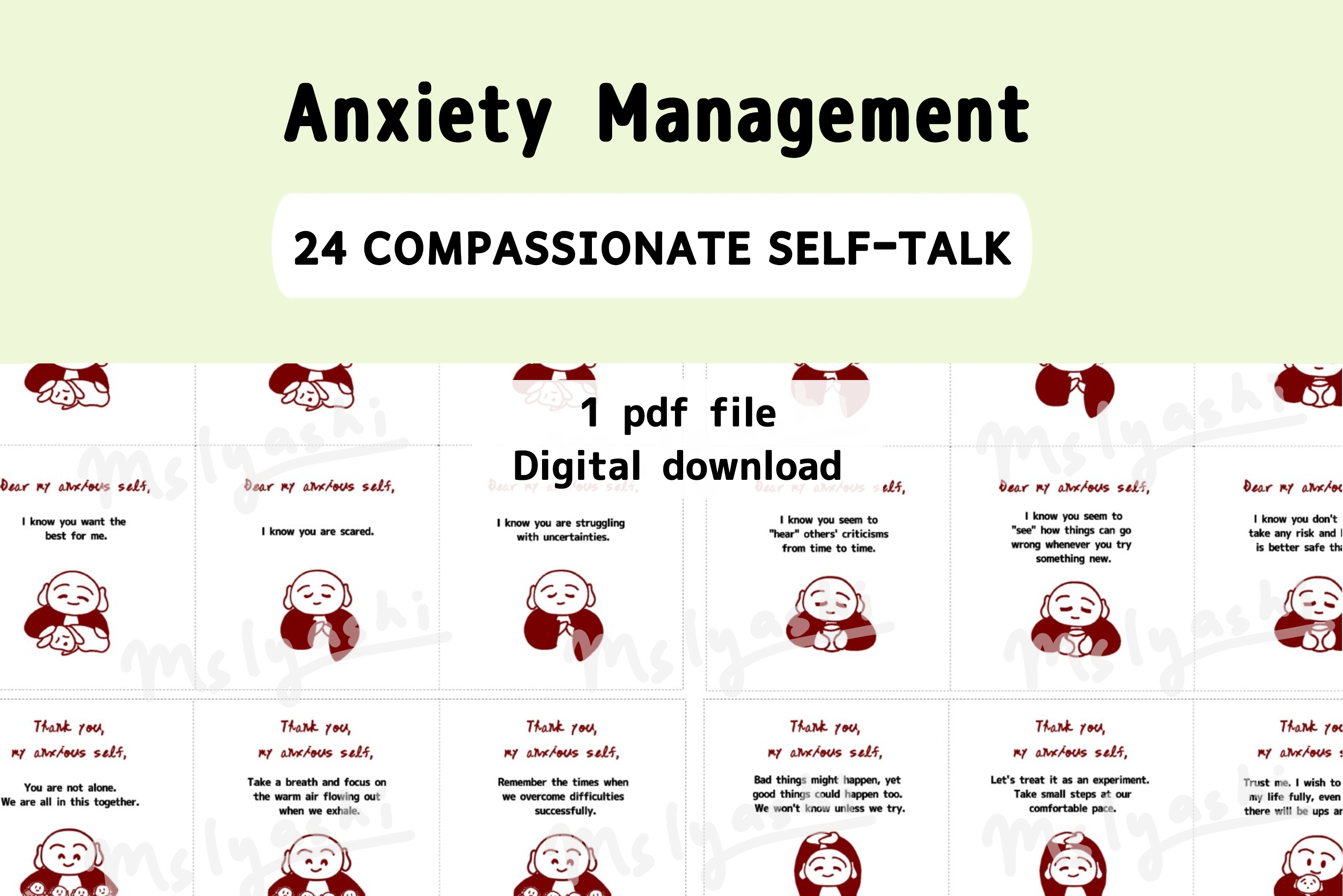 A set of 24 anxiety coping cards featuring messages of compassionate self-talk with our anxiety, completed with Baby Buddha illustrations.