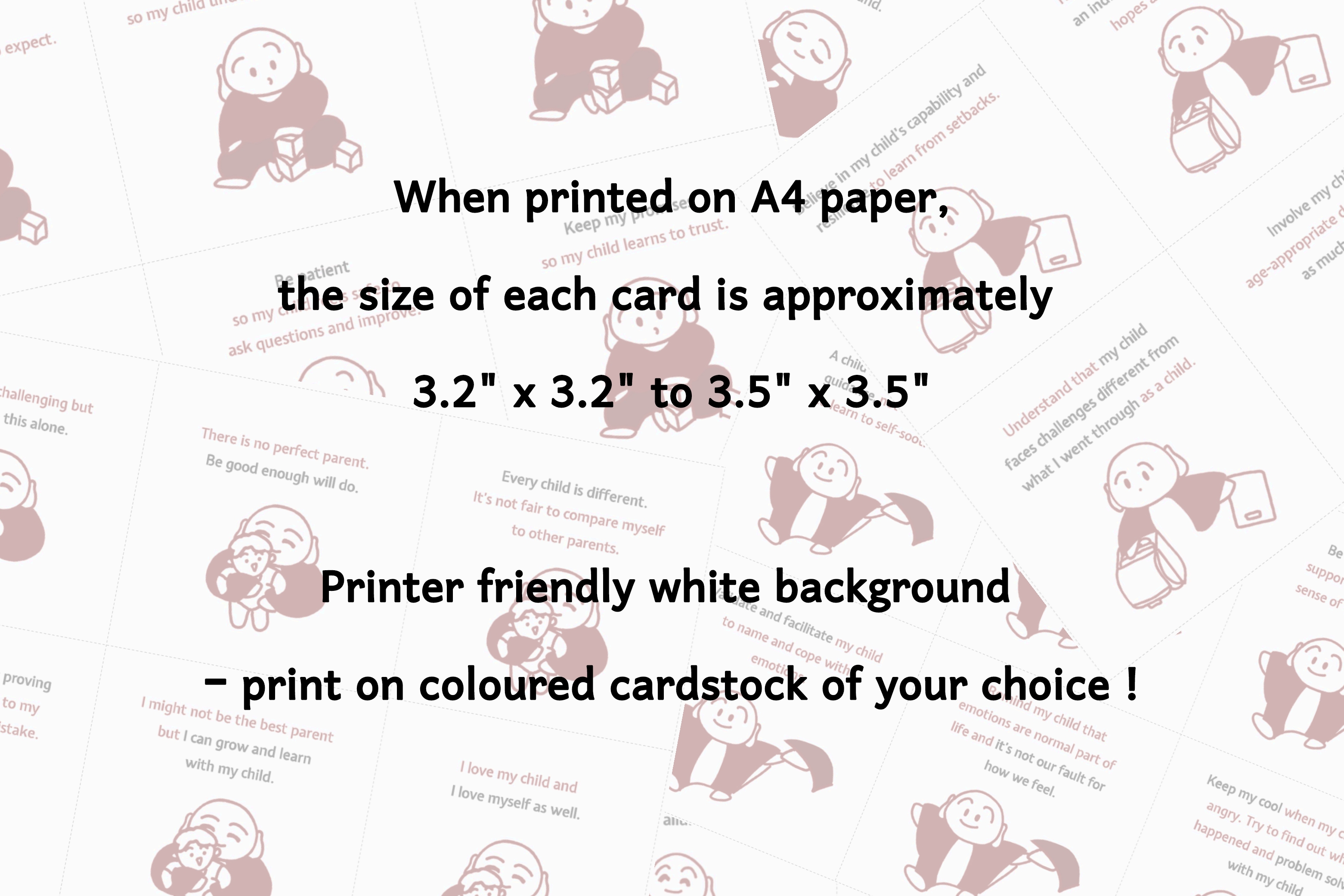 A set of 36 compassionate parenting reminder cards with baby buddha (ojizo) illustration. Printer friendly white background.