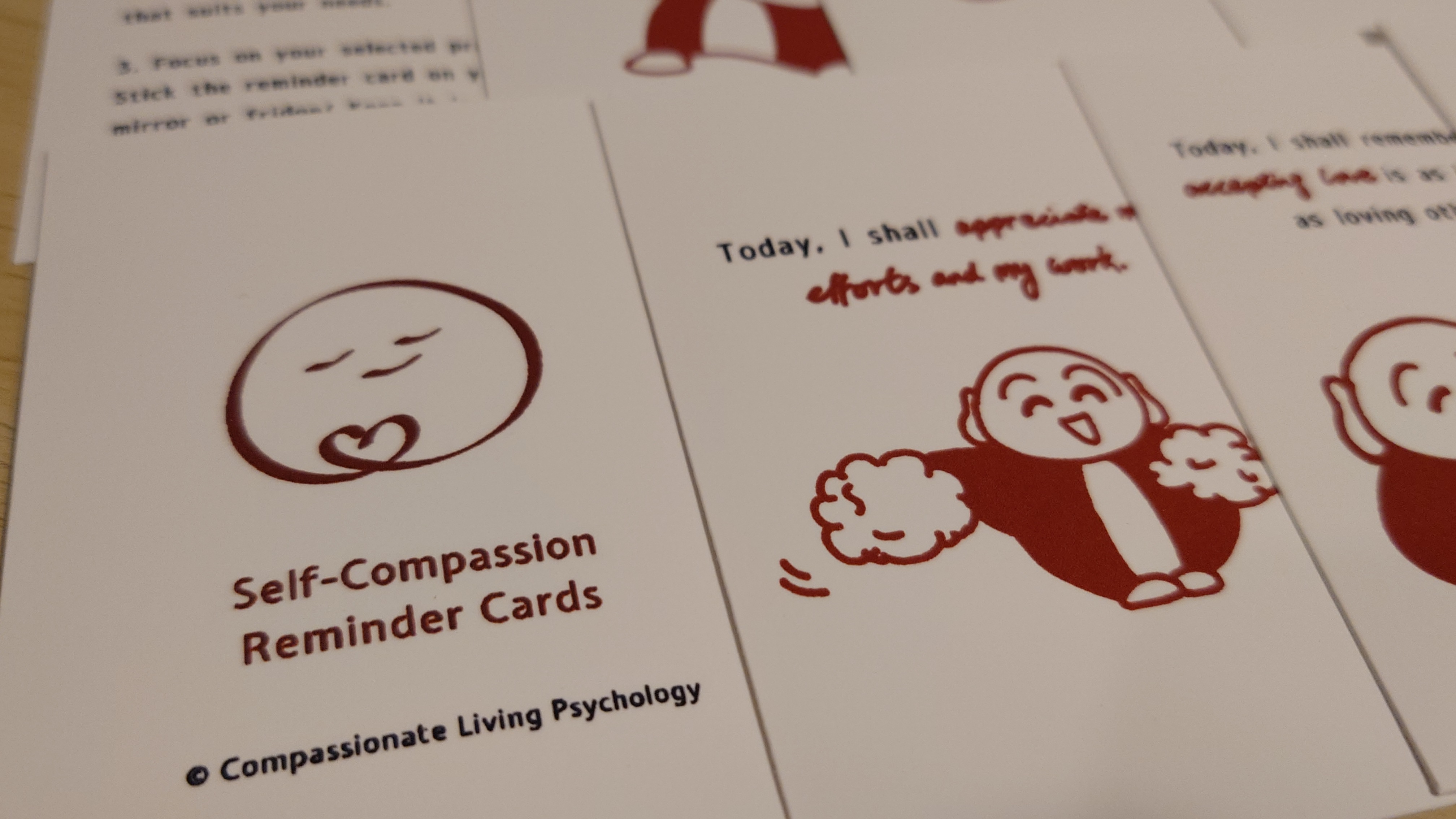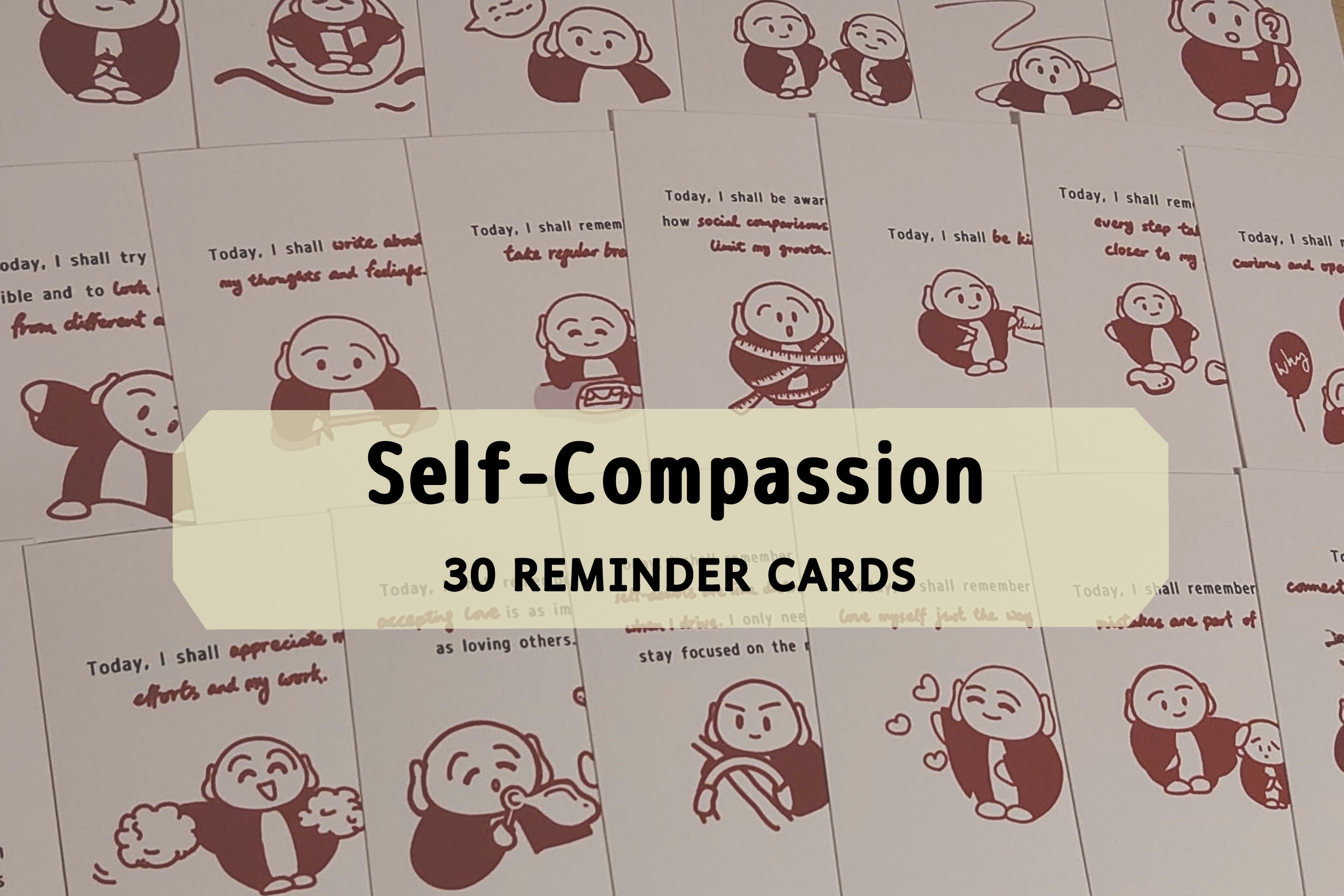 A set of 30 self-compassion reminder cards with baby buddha illustrations. Draw a card each morning or at any frequency of you choice as a practice reminder. You can also pick one of the cards, stick it on the fridge or keep it in your diary, and focus on your selected practice.