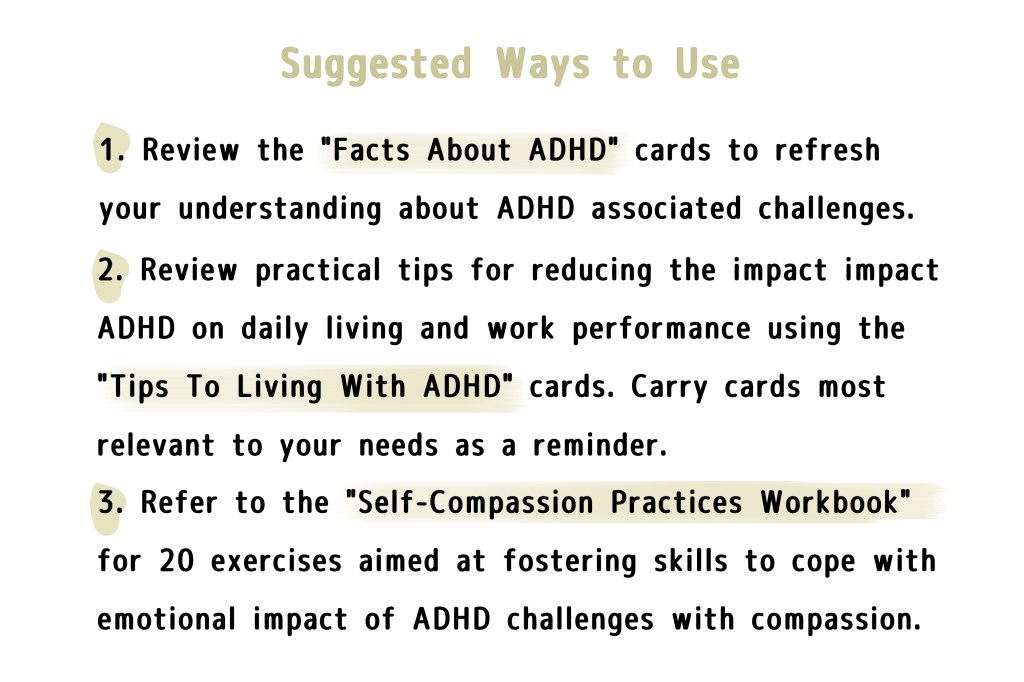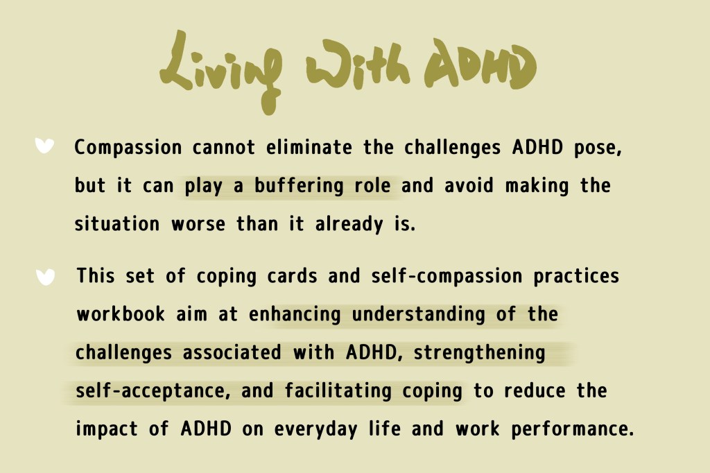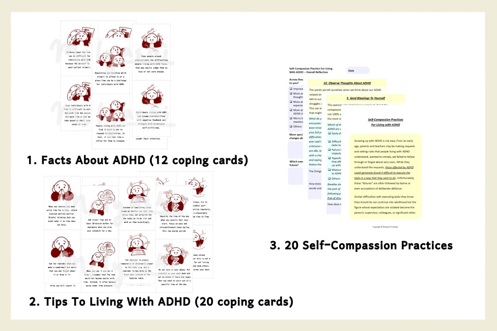 A set of 32 pain management coping cards covering ADHD related struggles, practical tips to manage the impact of ADHD and 20 self-compassion practices to enhance adjustment.