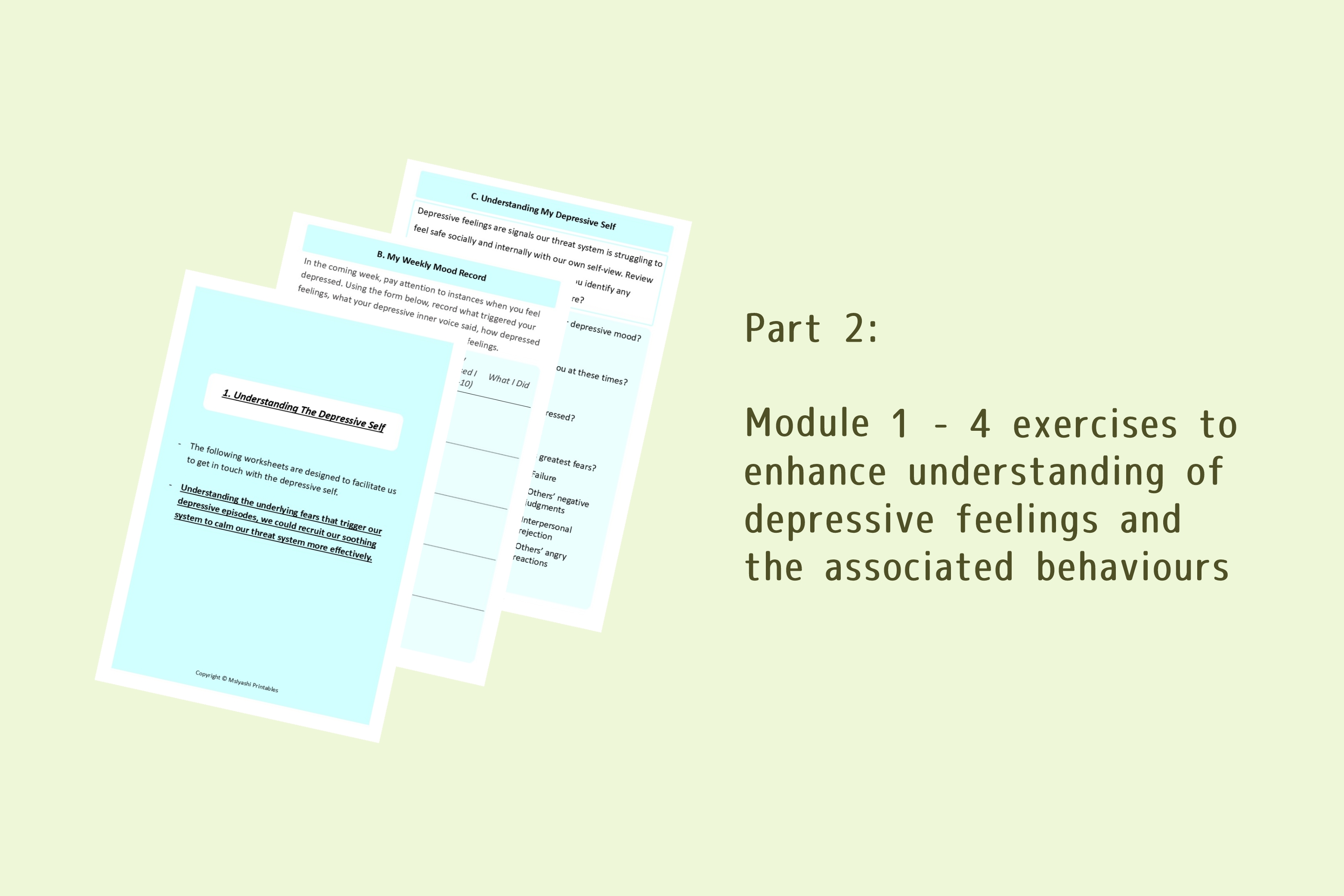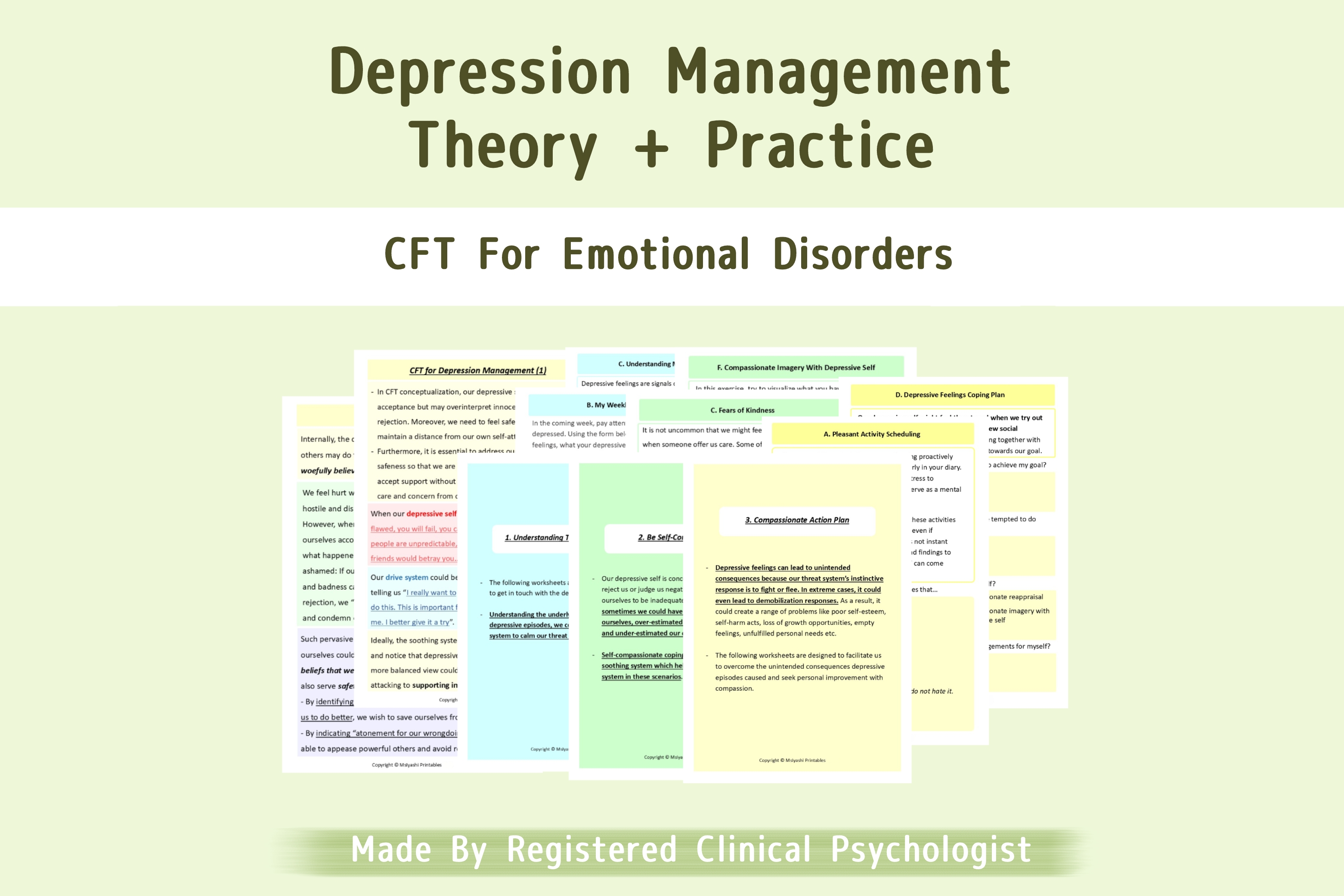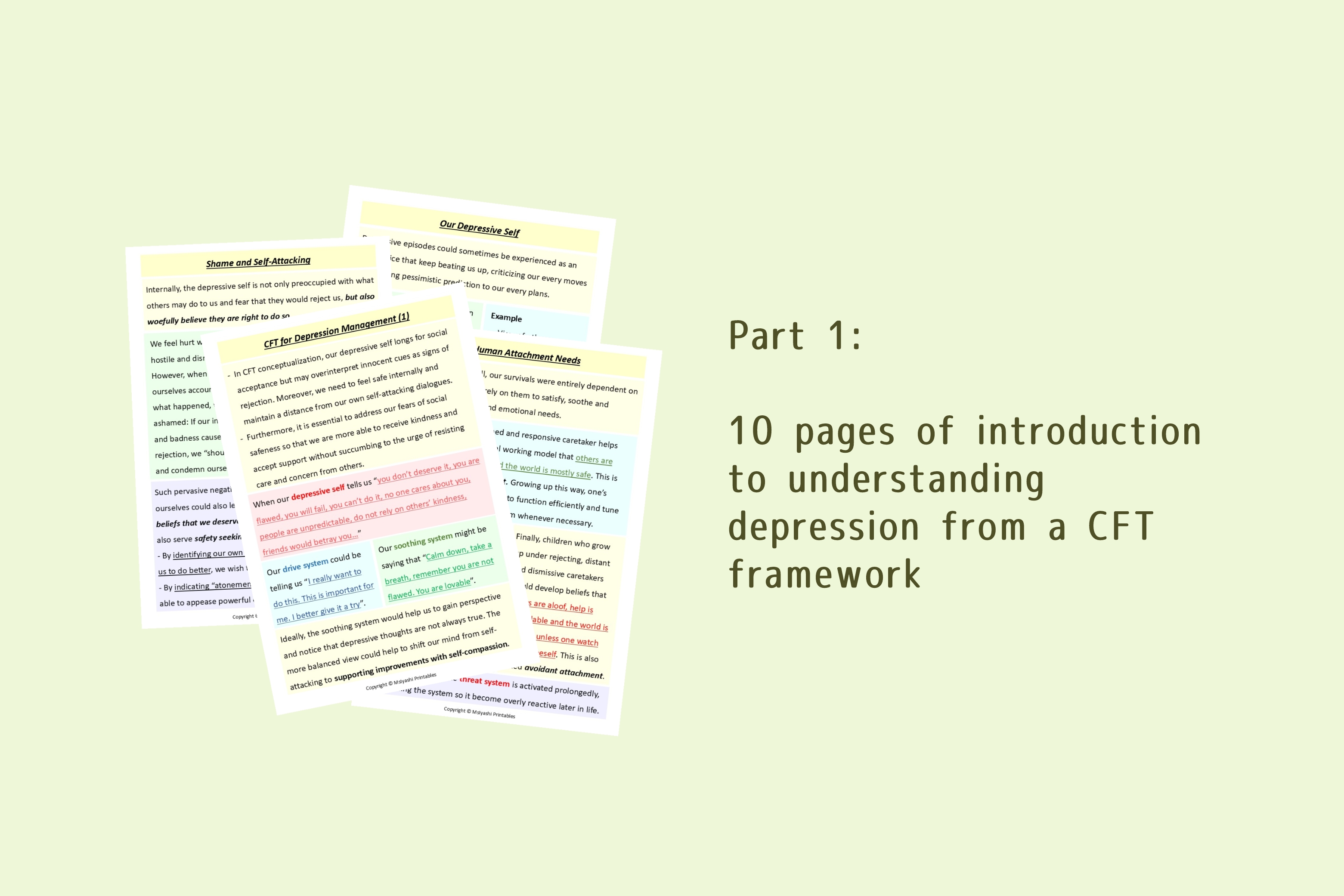 1. 10 pages of psychoeducation information sheets explaining the theory underlying CFT for depression;
