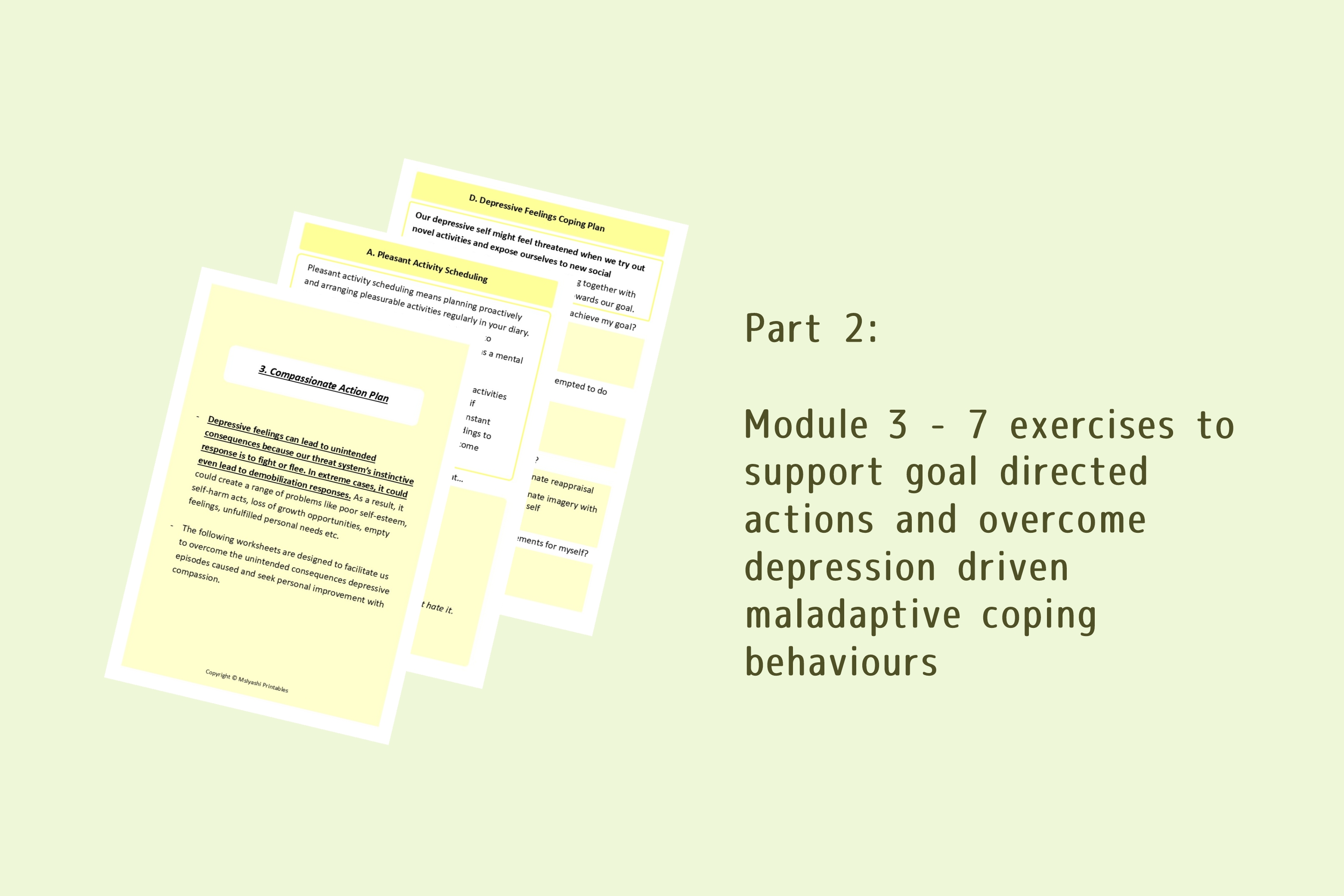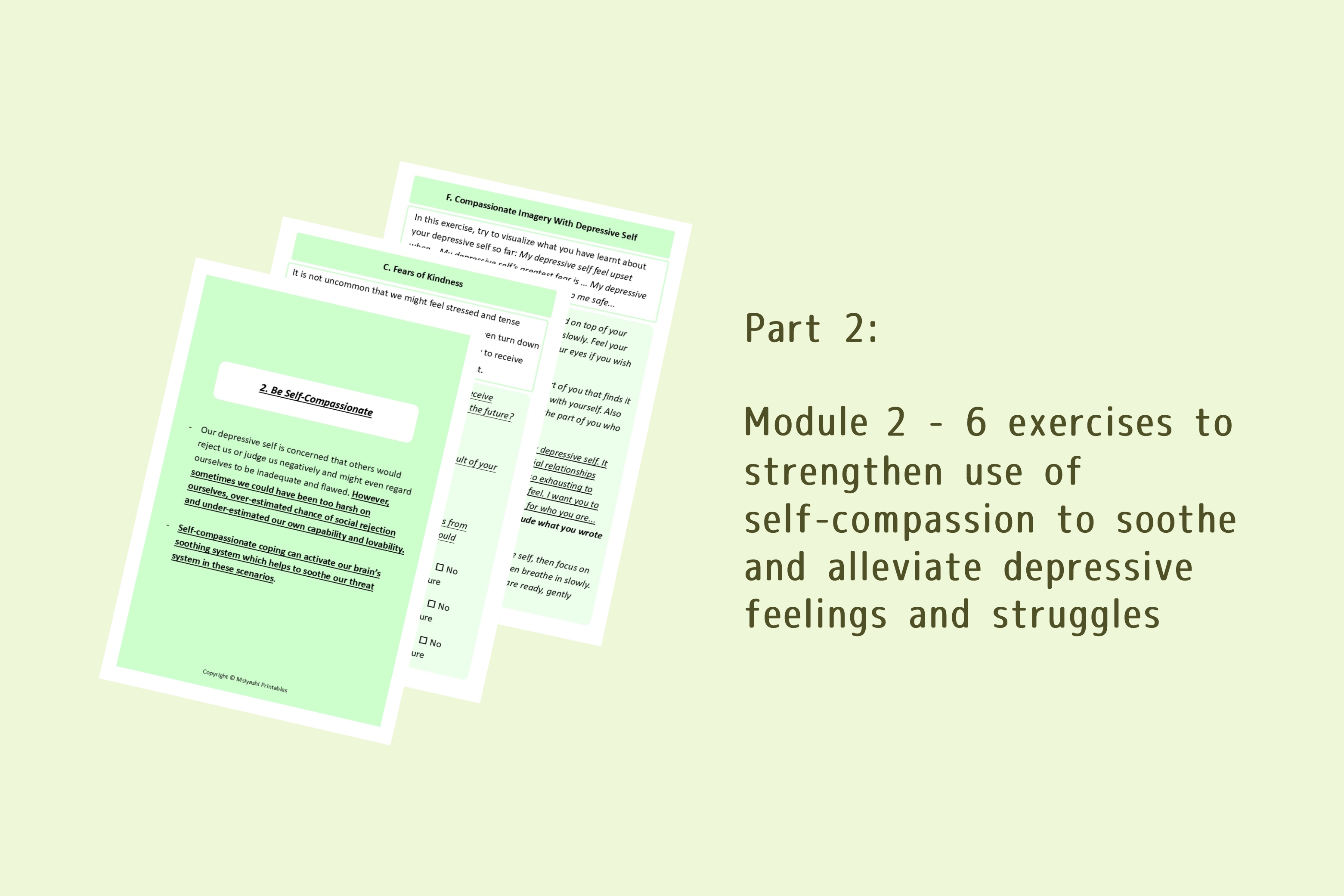 2. 32 pages of practices grouped into three modules, designed to strengthen skills in using compassionate self-talk to soothe our depressive self and overcoming depression driven maladaptive coping behaviors with compassion.
