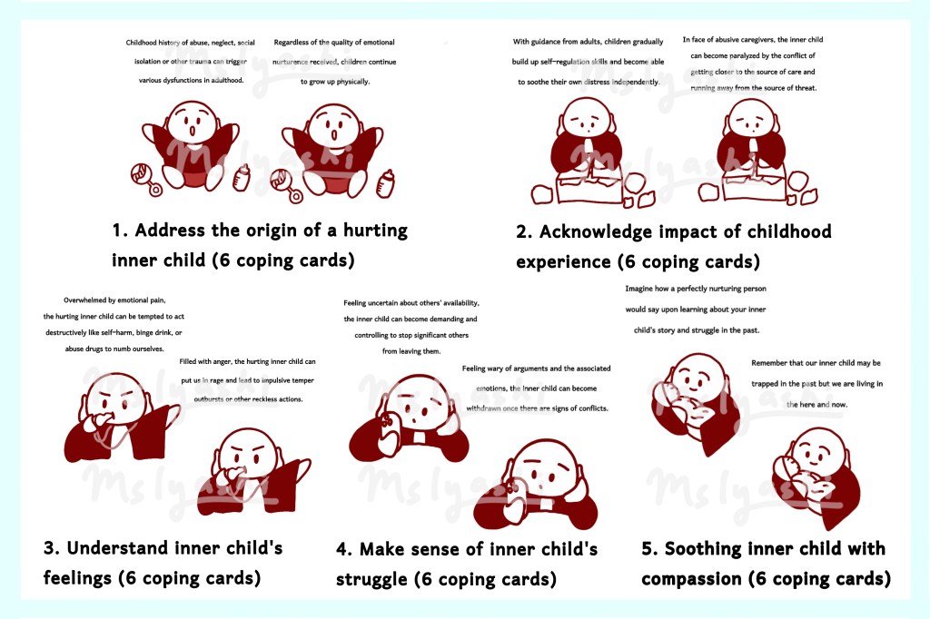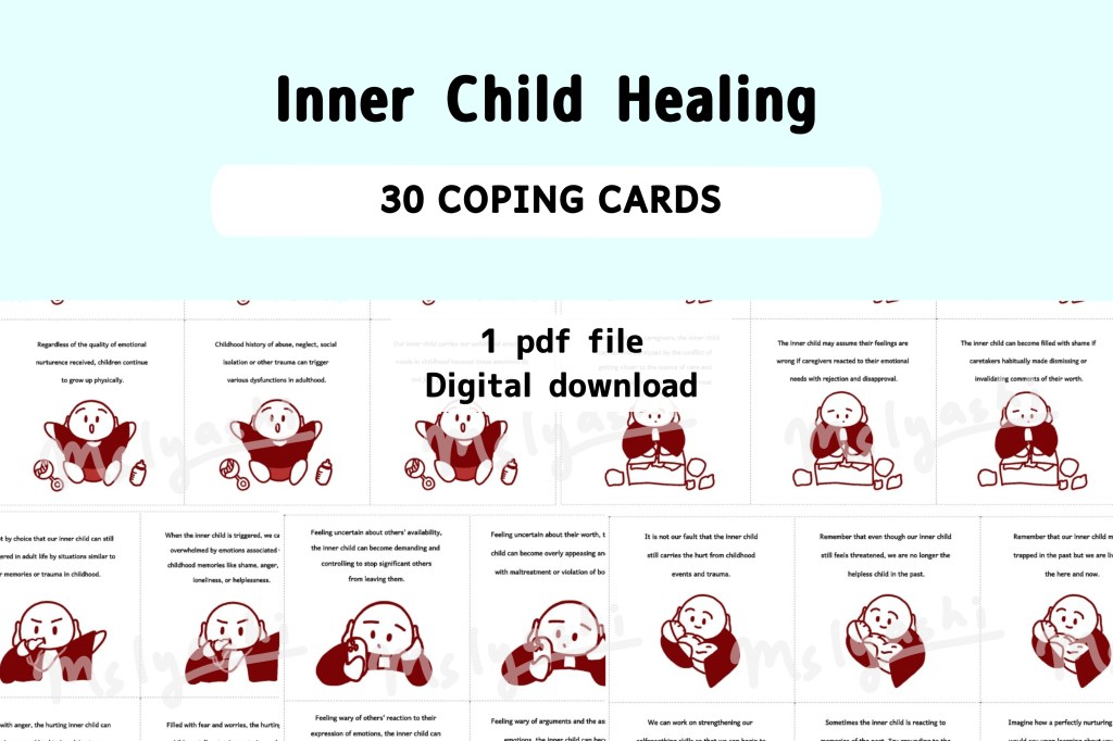 A set of 30 compassion focused reminders to facilitate healing from childhood trauma and the hurting inner child, completed with baby buddha illustrations.
