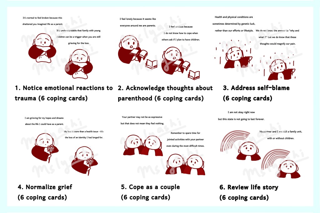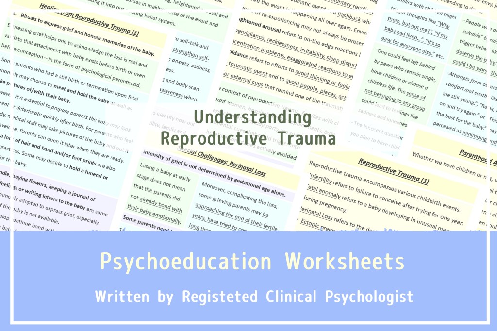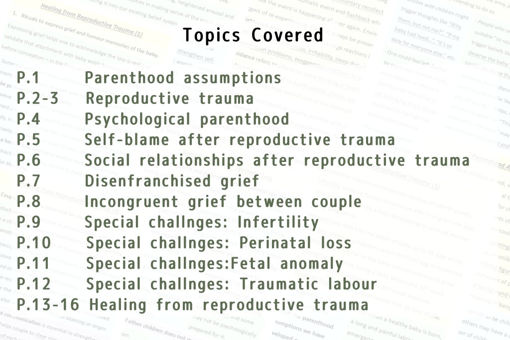 16 pages of psychoeducation information sheets covering the psychological impact of reproductive trauma.