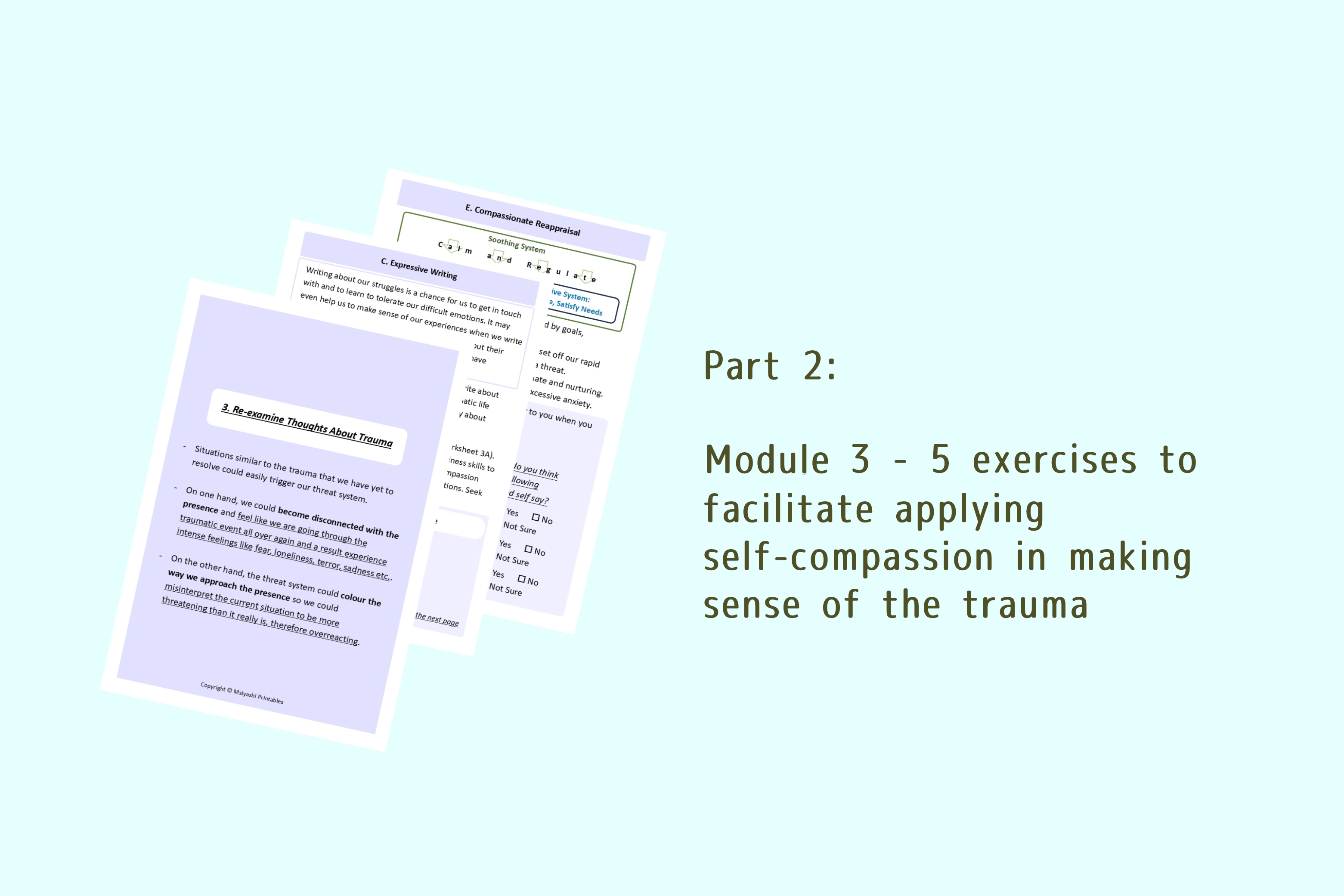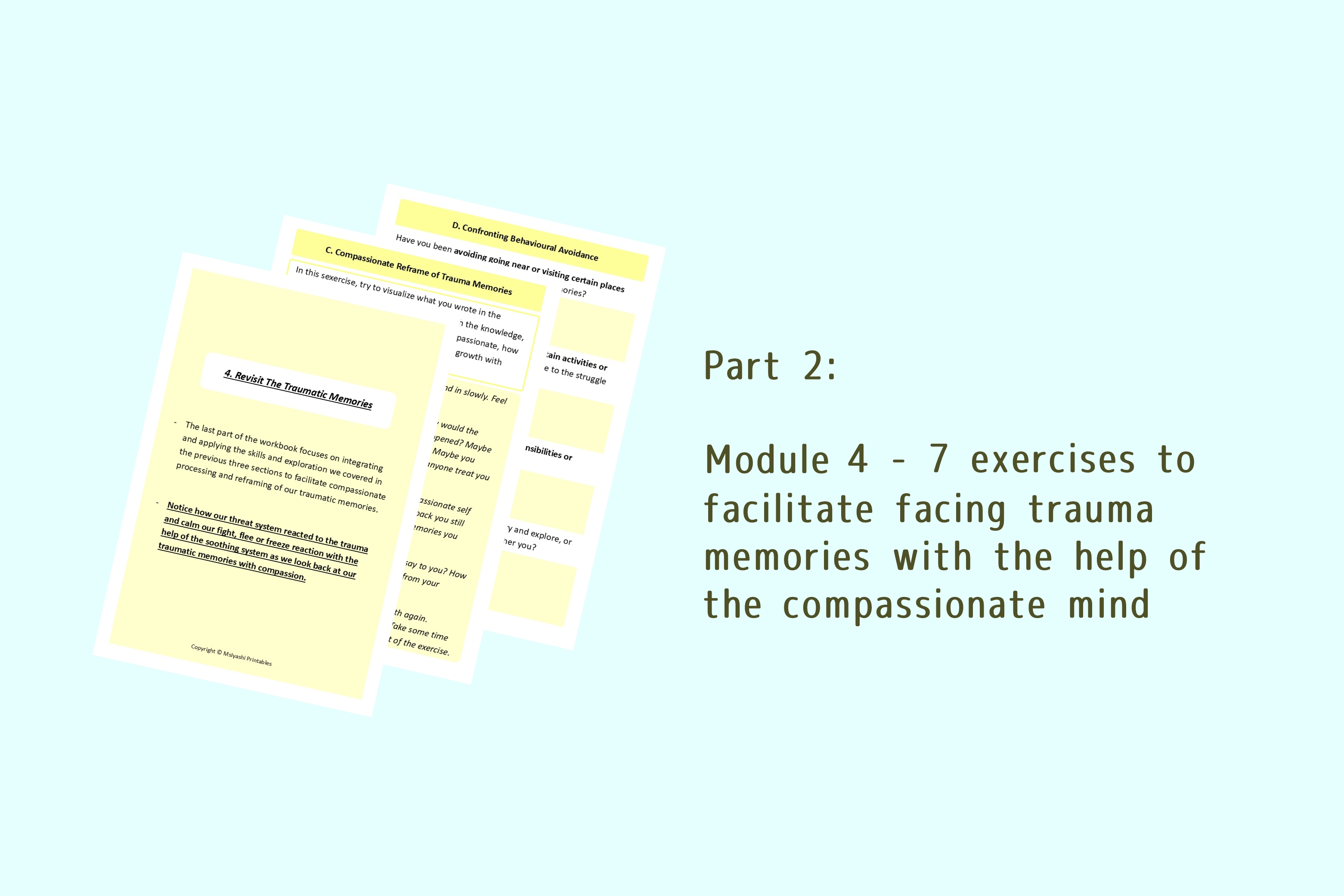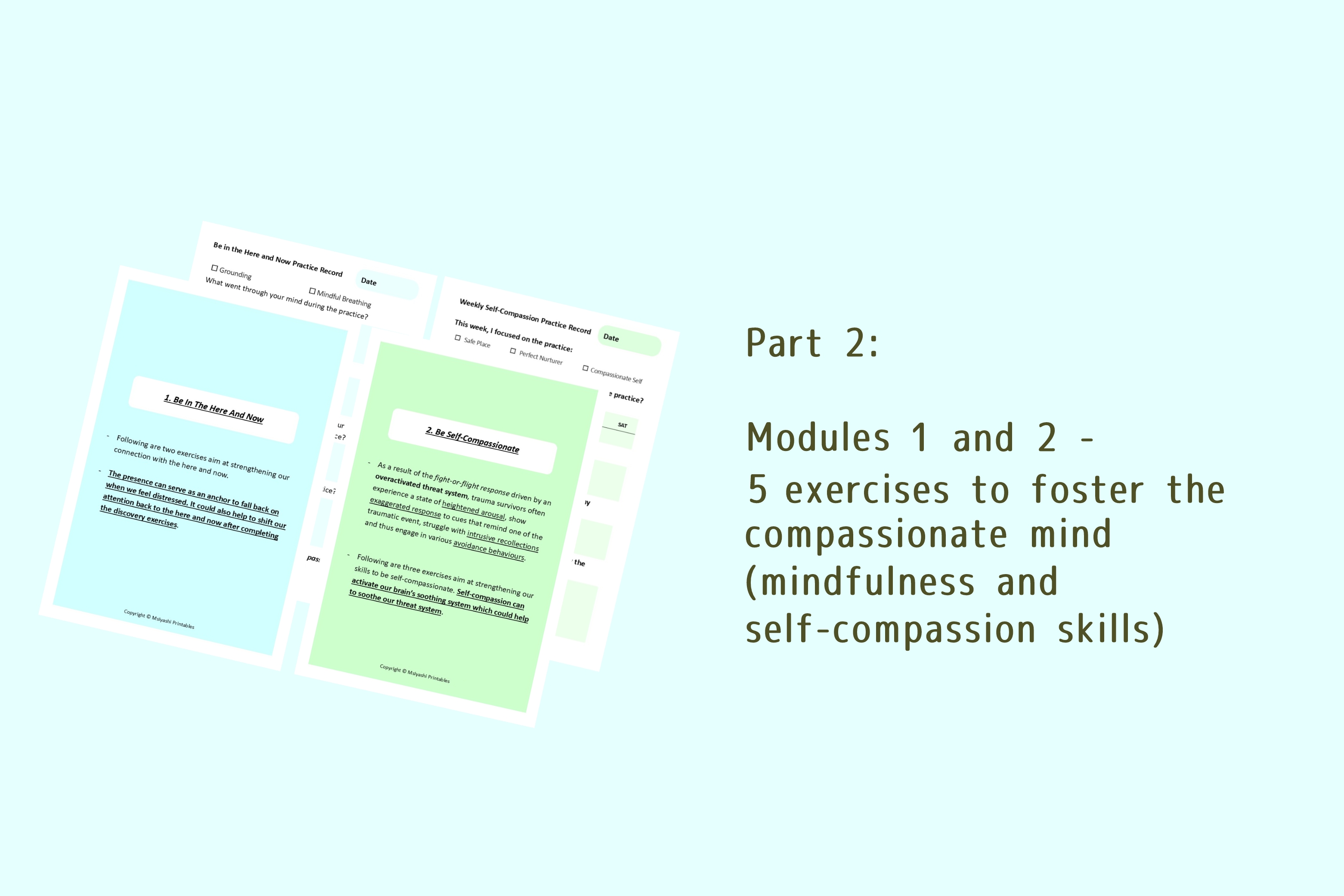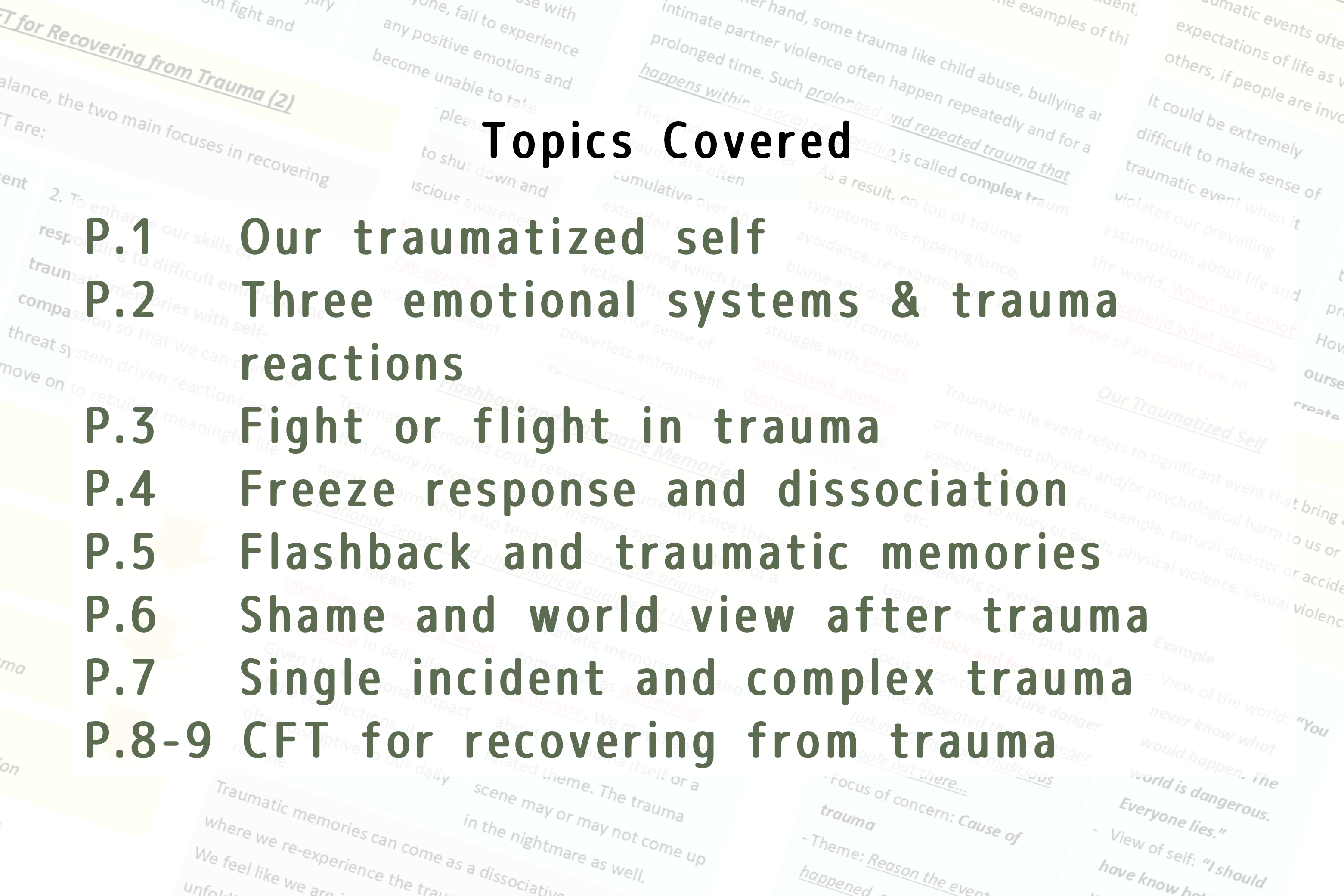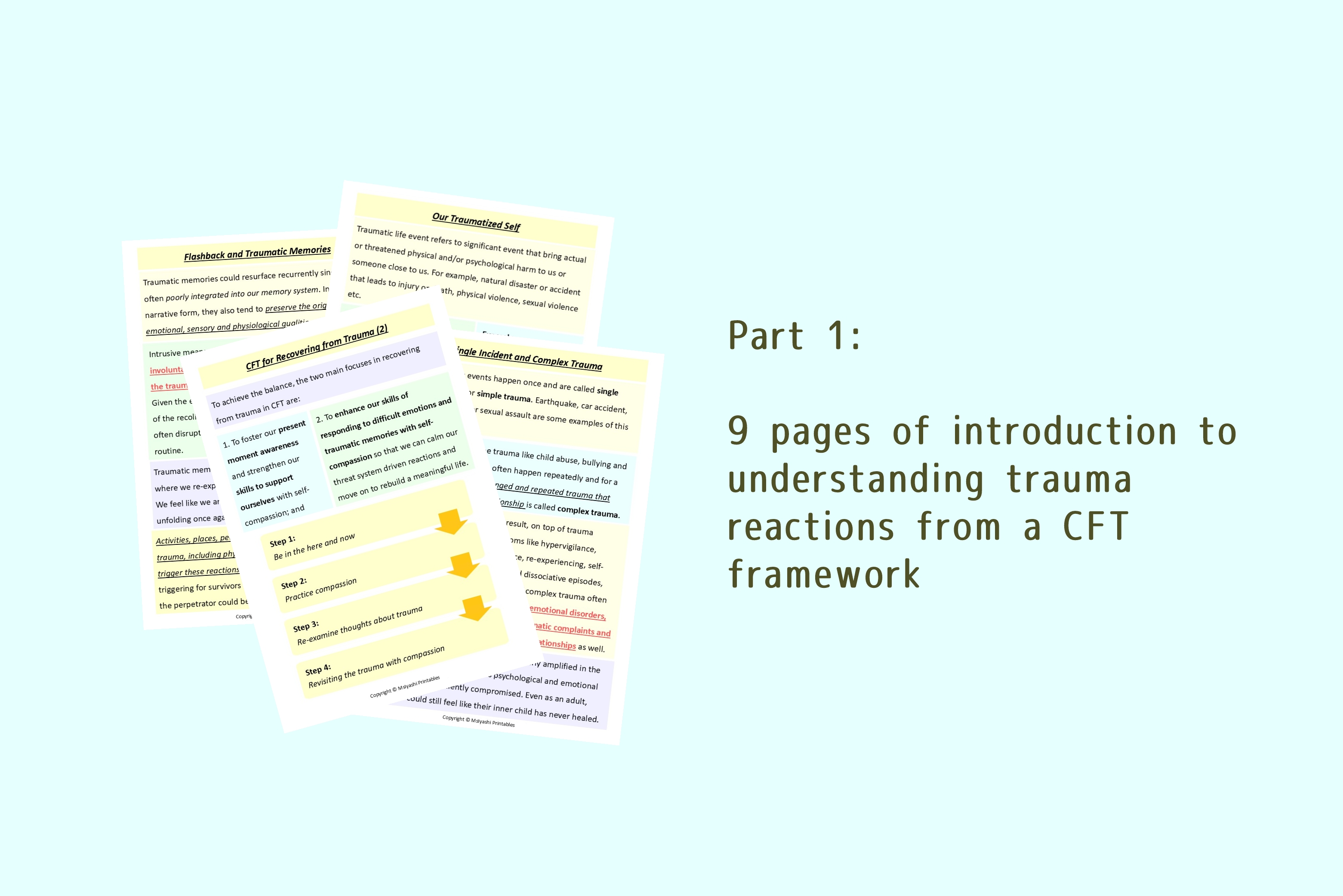 Nine pages of psychoeducation information sheets explaining the theory underlying CFT approach for recovering from trauma.